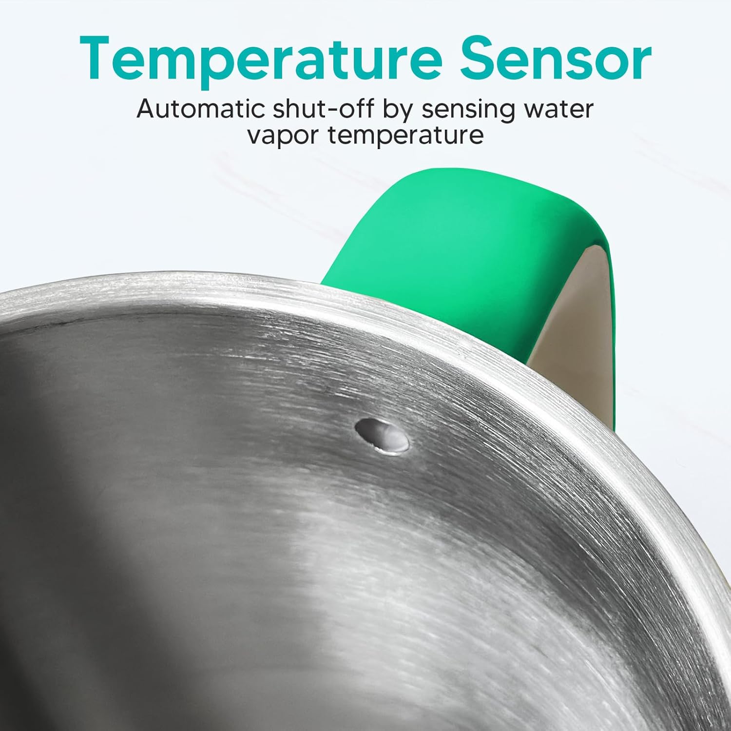 - ใAuto Shut Off with Boil-Dry Protectionใ~ Experience peace of mind with the electric kettle's auto shut off feature and boil-dry protection. Simply ensure the lid is covered before boiling. This tea kettle automatically turns off when water reaches boiling point or when no water is detected, preventing overheating and boiling dry. After shutdown, it enters standby mode, ready for your next boil