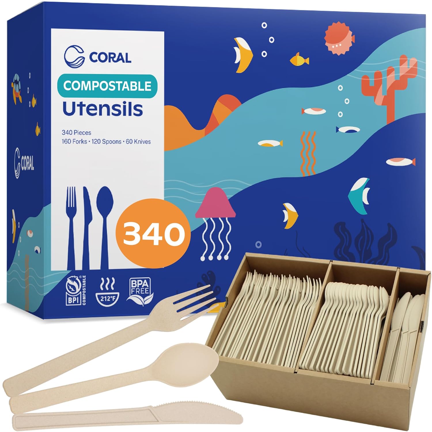 CORAL Light Brown 100% Compostable Silverware Set 340 Pieces - Heavy Duty 160 Forks, 120 Spoons, 60 Knives Bulk - Break Resistant with Smooth Edges, Ocean Friendly Alternative to Plastic Utensils