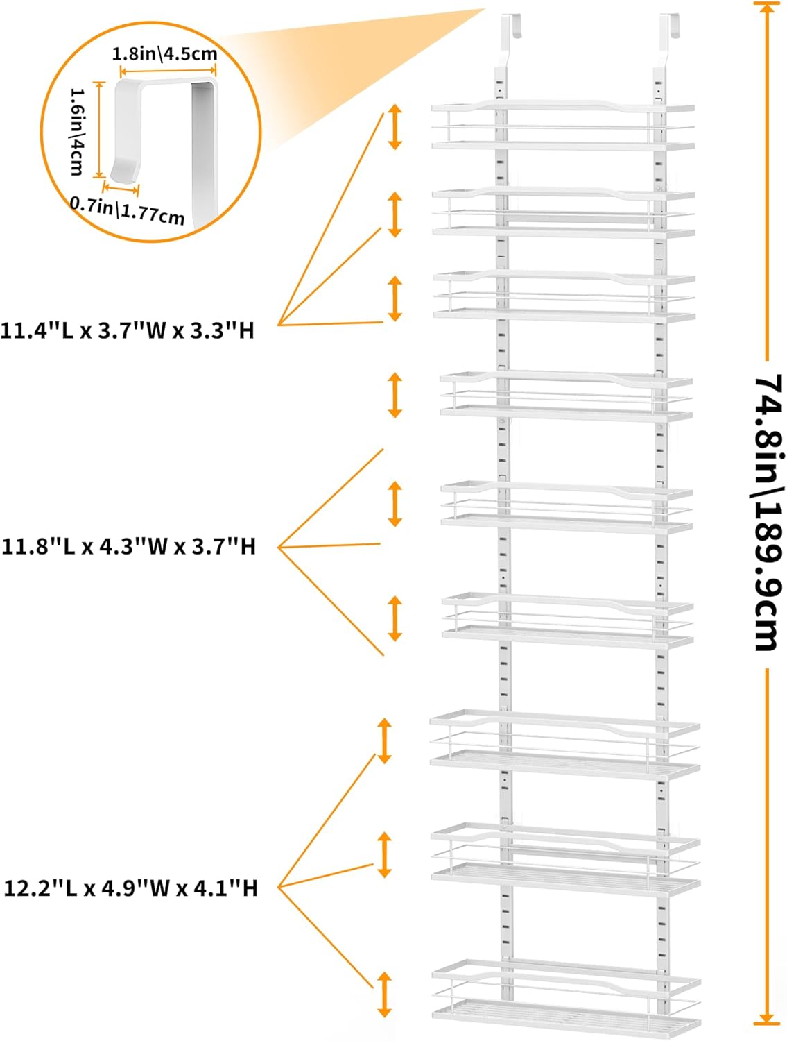 - You will get 3 large shelves (12.2"L x 4.9"W x 4.1"H), 3 medium shelves (11.8"L x 4.3"W x 3.7"H ), 3 small shelves (11.4"L x 3.7"W x 3.3"H), including all necessary mounting hardware. The overall height after installation is 6.2ft, suitable for most doors. USPTO Patent Number:29884987
