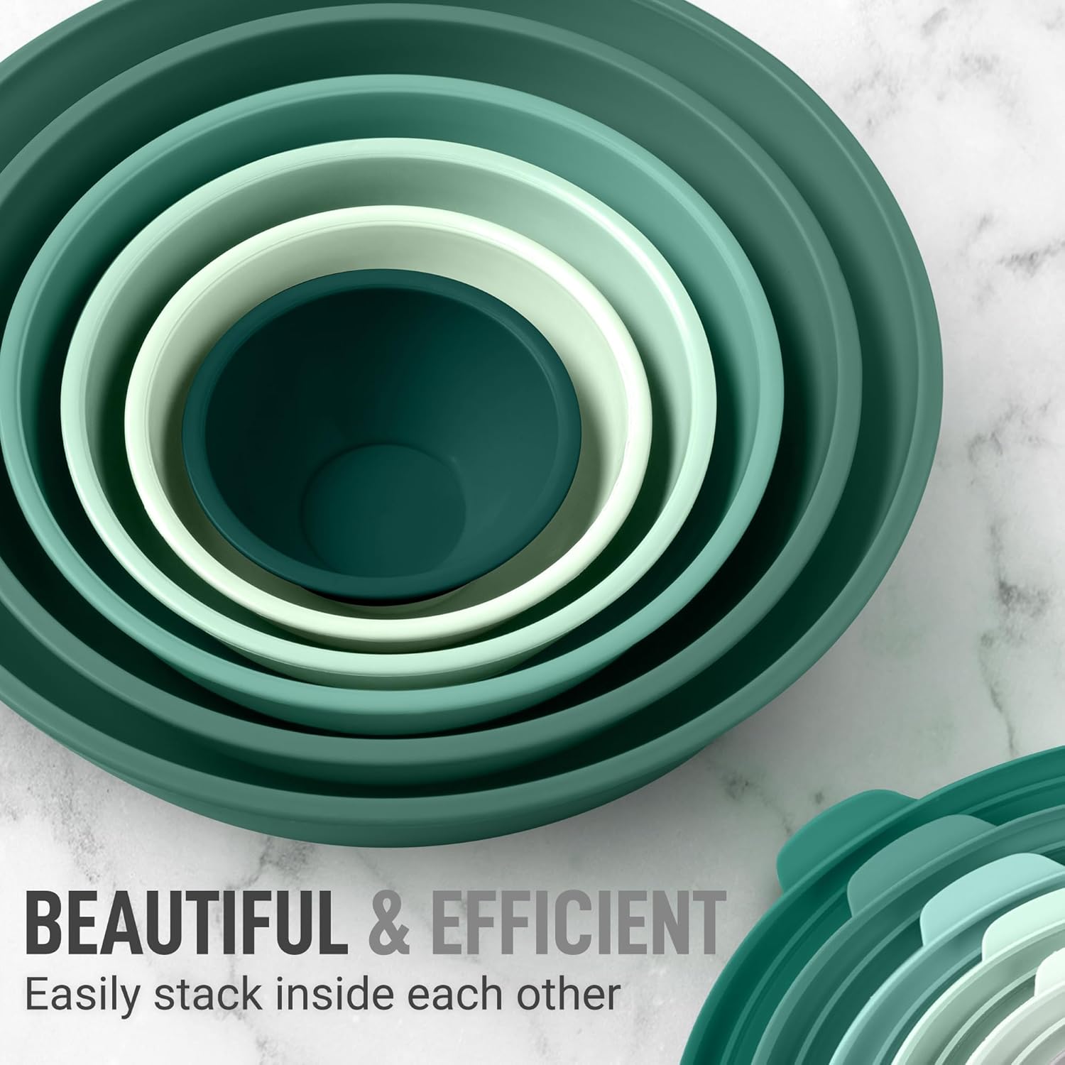 - STACKABLE, EASY TO CLEAN DESIGN: These nesting mixing bowls for kitchen can be stacked on top of each other to save space. The plastic bowls with lids are top-rack dishwasher friendly and can also be hand washed with soap and water (avoid the use of abrasive sponges).