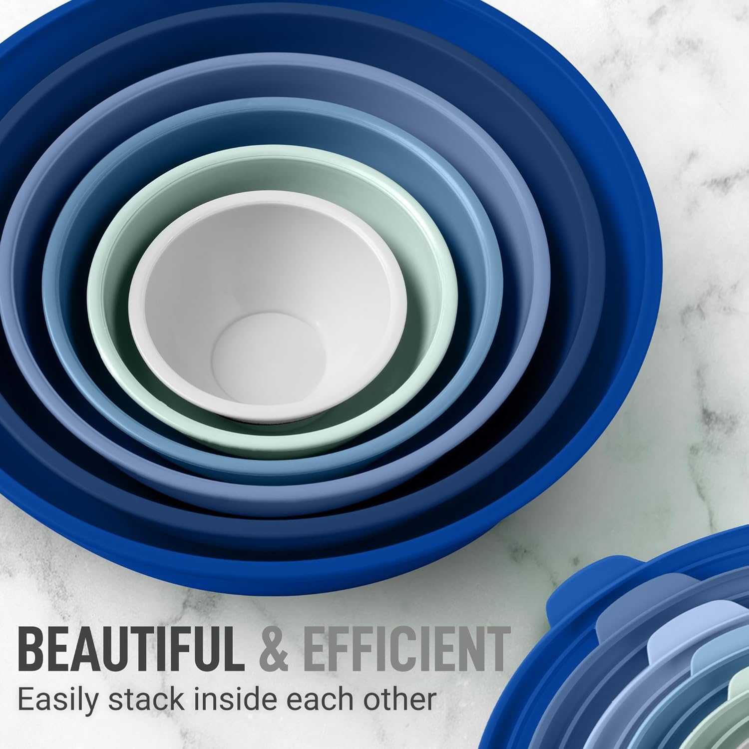 - STACKABLE, EASY TO CLEAN DESIGN: These nesting mixing bowls for kitchen can be stacked on top of each other to save space. The plastic bowls with lids are top-rack dishwasher friendly and can also be hand washed with soap and water (avoid the use of abrasive sponges).