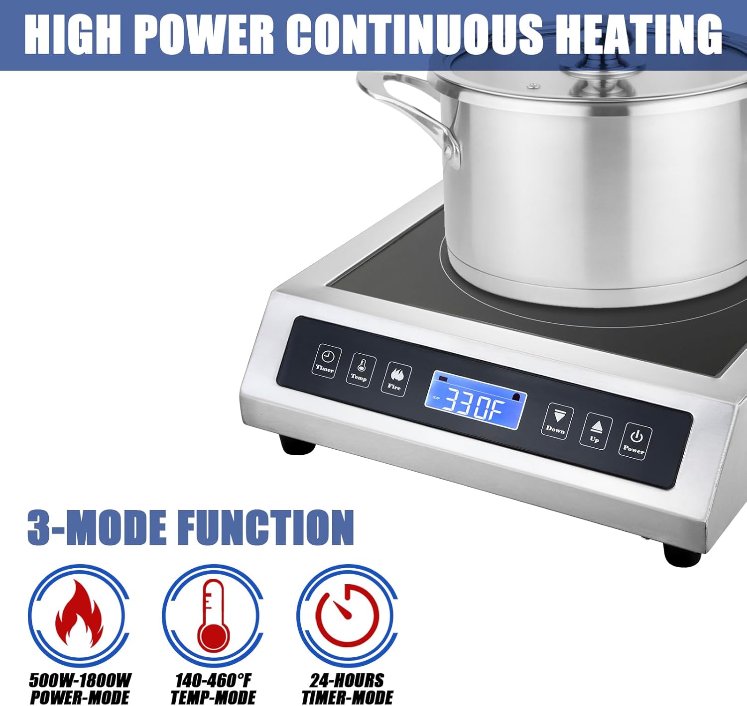 - HIGH EFFICIENCY: This commercial induction cooktop choose from 10 preset power levels (500W to 1800W) and 10 preset temperature level settings (140ยฐF to 460ยฐF). With an 83% energy efficiency rating, induction cooker is more efficient than traditional gas or electric stoves yet provides quick heat-up and faster cooking times.