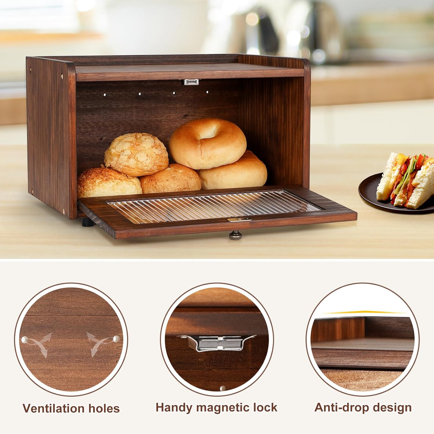 - 【Acrylic Door】The door of our breadbox with translucent acrylic window can eliminate the need for frequent opening to assess the interior and minimize exposure of bread to external air. Acrylic's durability and resistance to wear and tear also reduce the risk of injuries caused by breakage