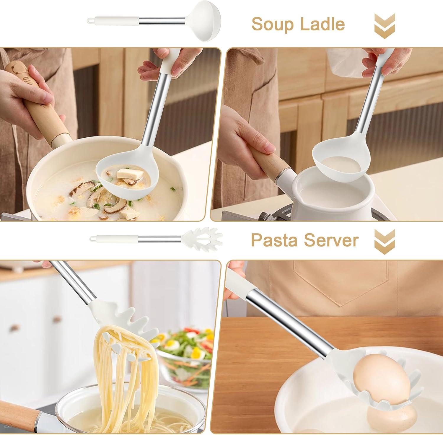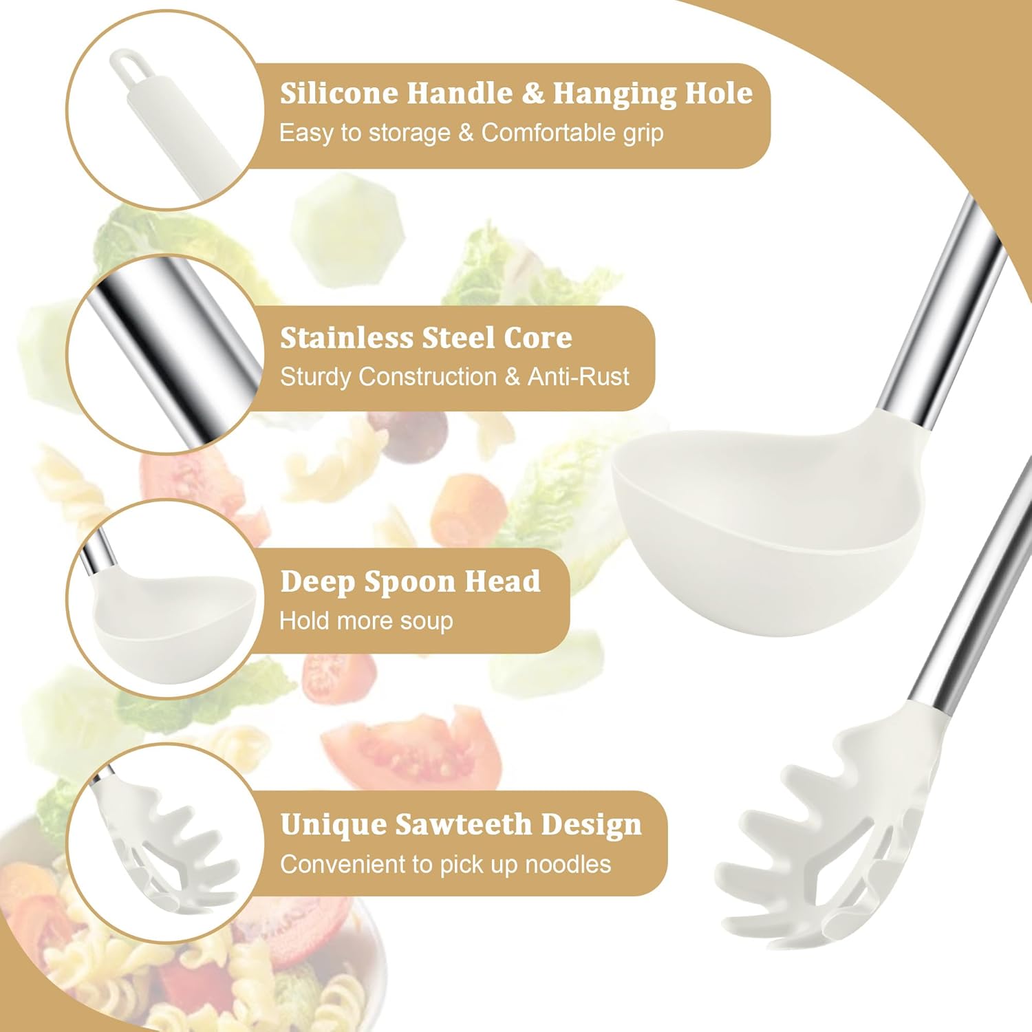 - Pack of 2 & Multi-Use: White silicone kitchen utensil set of 2 included soup ladle and pasta server, Ladle spoon ideal for serving soup, sauce and milk, Pouring pancake batter, Pasta fork great for picking up noodles and spaghetti, Draining hot water, An essential set in your kitchen.