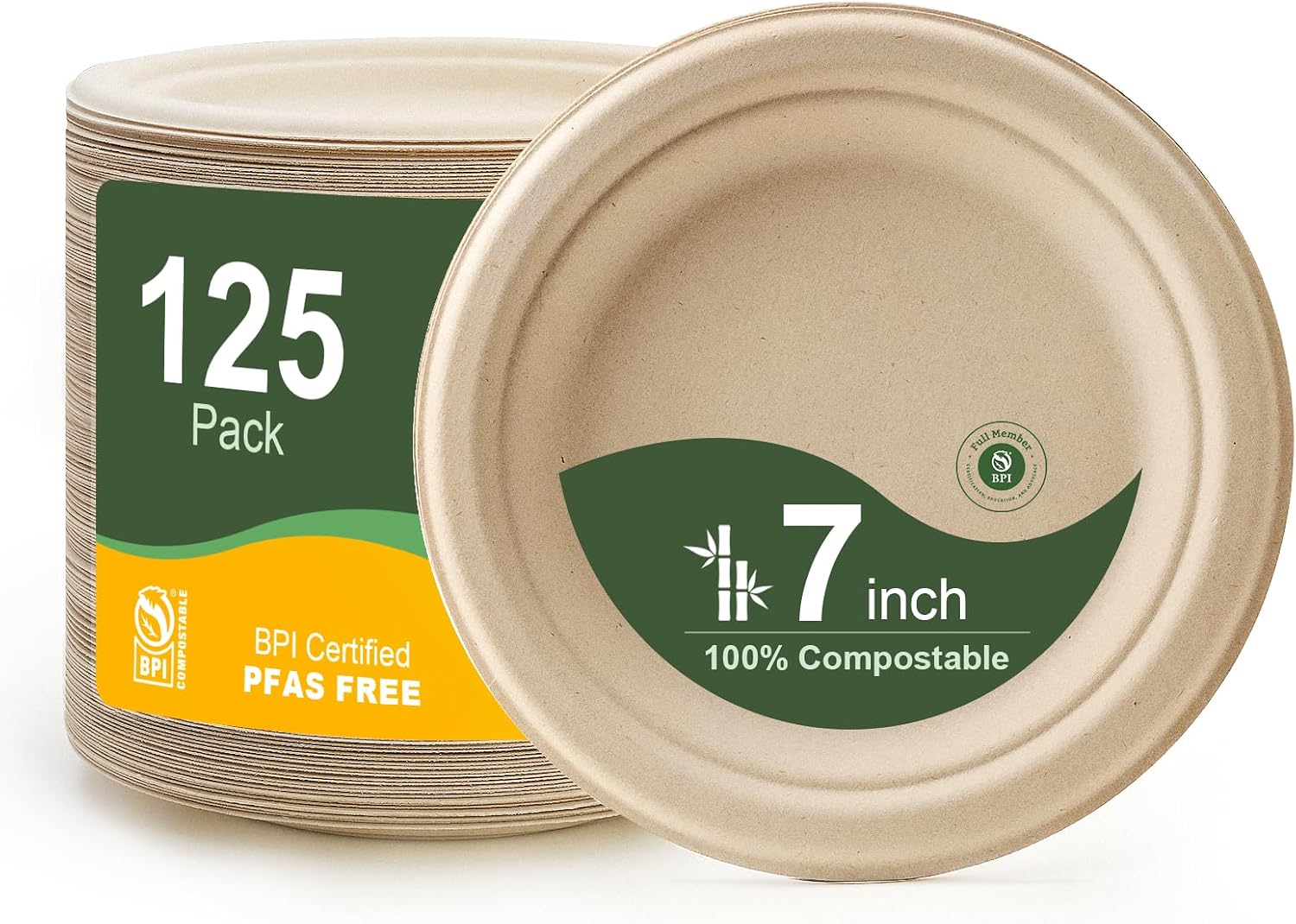 WELLIFE 100% Compostable Paper Plates 7 Inch, 125-Pack Dessert Paper Plates Bulk, Biodegradable Bagasse,Eco-Friendly Disposable Plate Small for BBQ,Picnic,Party (BPI Certified,Microwaveable)