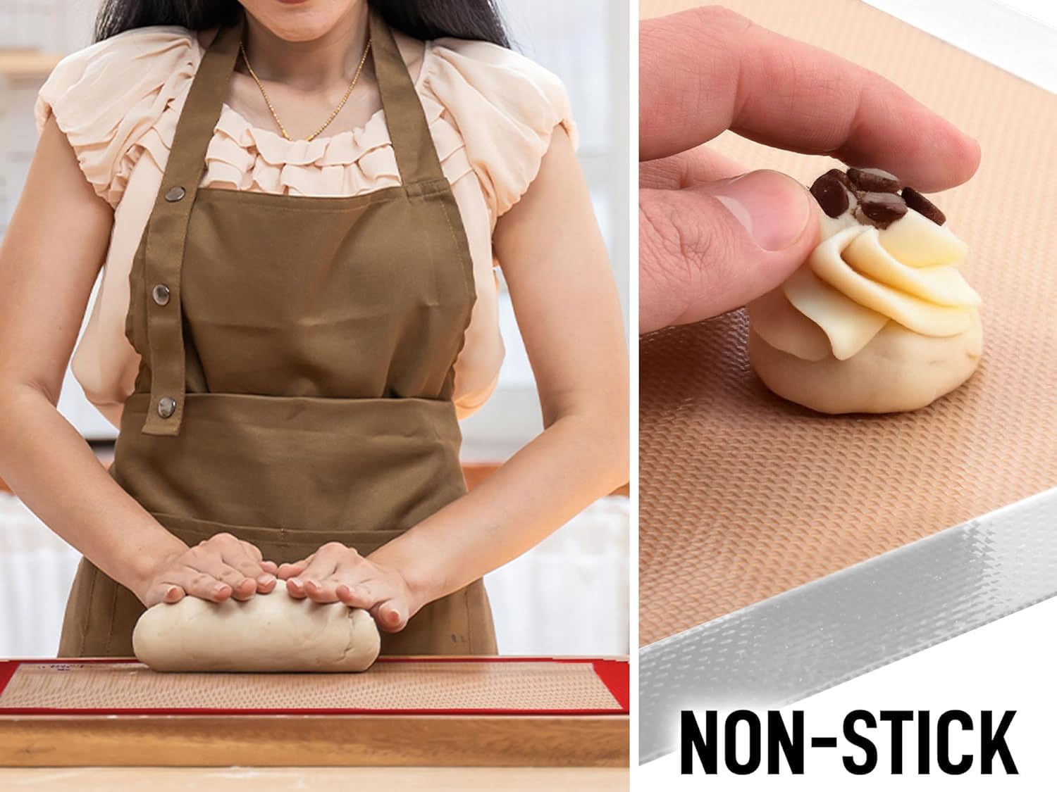 - NON-STICK & EVEN HEAT DISTRIBUTION: Perfect for both dry and sticky ingredients, say goodbye to using cooking sprays, foil, or parchment paper, our reusable silicone baking mats provide a non-stick surface, making them perfect for rolling or prepping sticky ingredients. Achieve even heat distribution for perfectly baked results every time, and protect your pans from any mess with our silicone baking set.