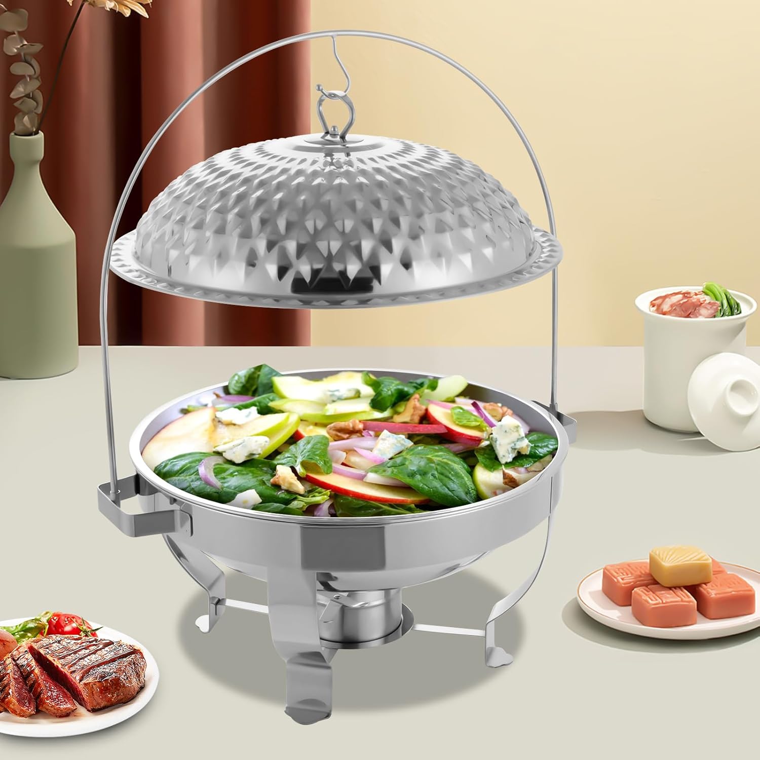 Chafing Dish Buffet Set, Stainless Steel Hanging Lid Dining Stove, Roll Top Chafing Dish Buffet Diamond-Shaped Lid and Round Stand for Buffet Restaurants and Banquets (Silver, 8L/8.5QT)