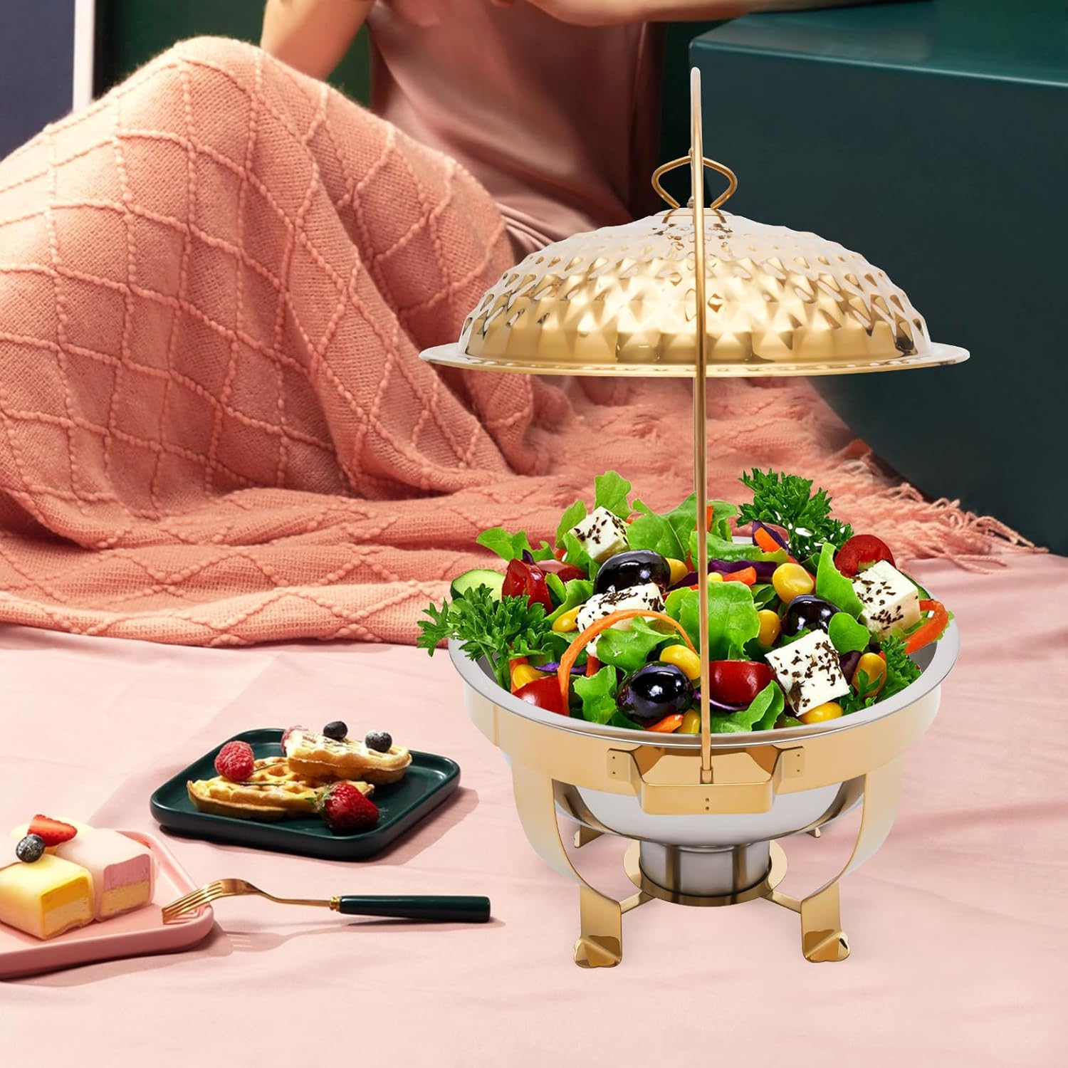 Chafing Dish Buffet Set, Stainless Steel Hanging Lid Dining Stove, Roll Top Chafing Dish Buffet Diamond-Shaped Lid and Round Stand for Buffet Restaurants and Banquets (Gold, 4.5L/4.76Qt)
