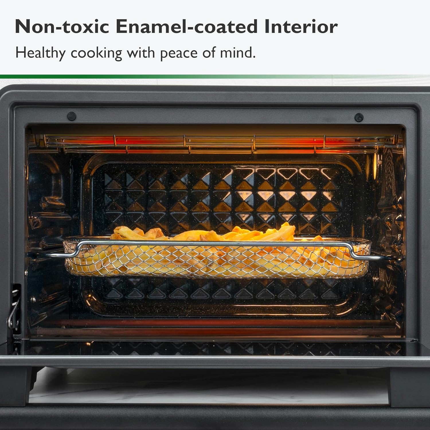 - Safe and Non-Toxic Enamel Coating Interior Wall: VAL CUCINA's air fryer oven's interior features a heavy duty enamel coating cavity, providing you with a healthier and safer cooking experience. (Only three side walls of the cavity are coated with enamel β the crumb tray and the ceiling are not )
