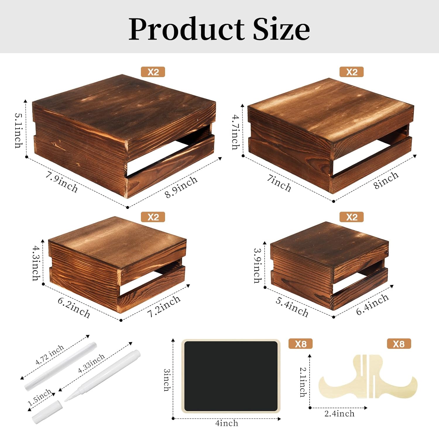 - Your Party's Sweet Companion: You will receive a set of 8 wooden cake stand risers (available in 4 sizes), 8 wooden signs and 2 pens, enough quantity and different sizes to meet the needs of different sizes of cakes, snacks and desserts for display. The wooden signs can be used to write down hints for ease of use while adding elegance to your dessert table.These wooden stackable display boxes will not take much displaying space