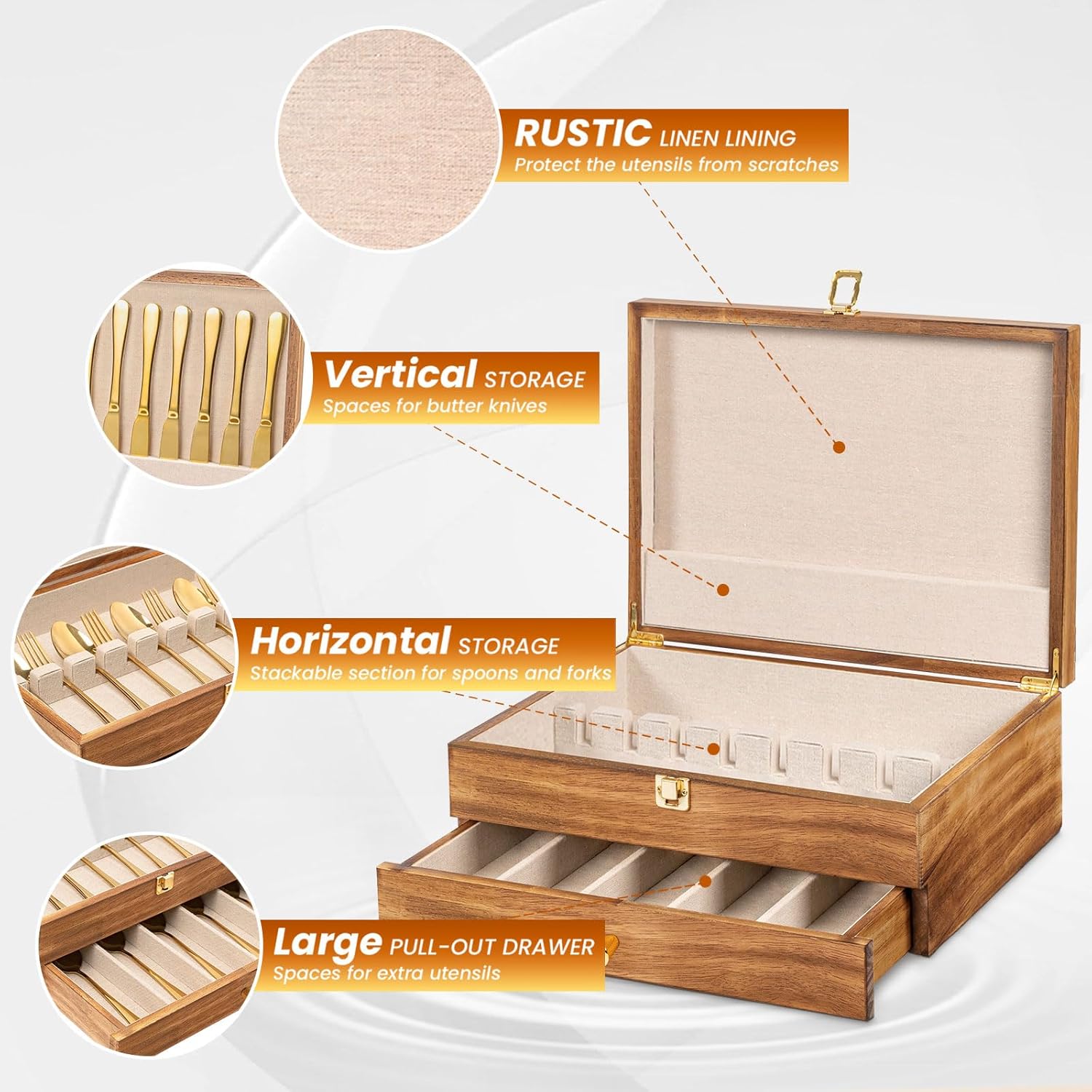- Authentic Wood Craftsmanship: Crafted from solid wood in a rustic country style, this sturdy and durable silverware chest exudes a sense of luxury. The silverware boxes for flatware features the linen lining to effectively prevent scratching or damage to your silverware, ensuring they're intact for years to come.