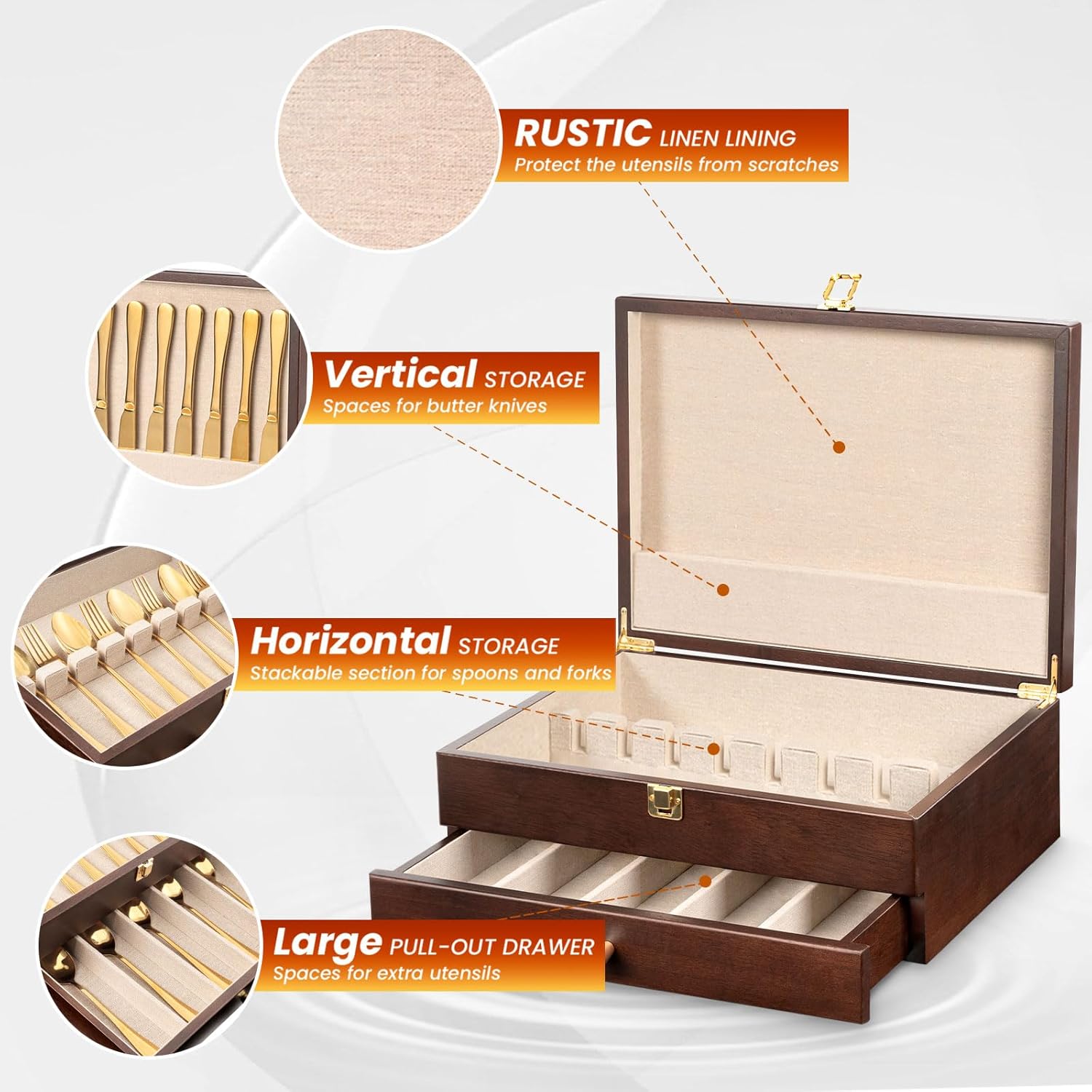 - Authentic Wood Craftsmanship: Crafted from solid wood in a rustic country style, this sturdy and durable silverware chest exudes a sense of luxury. The silverware boxes for flatware features the linen lining to effectively prevent scratching or damage to your silverware, ensuring they're intact for years to come.