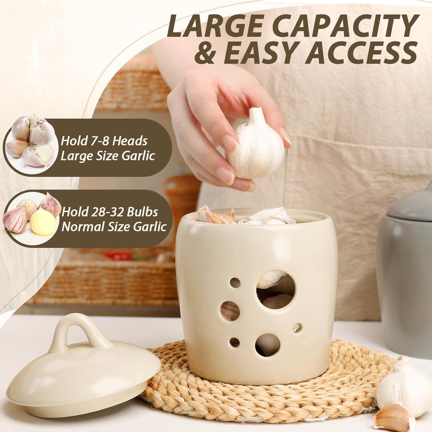 - Elegant Grey Ceramic Design: Made from premium gray ceramic, this garlic container storage boasts a sleek and elegant look that complements any kitchen dΓ©cor, serving as both a functional and decorative piece