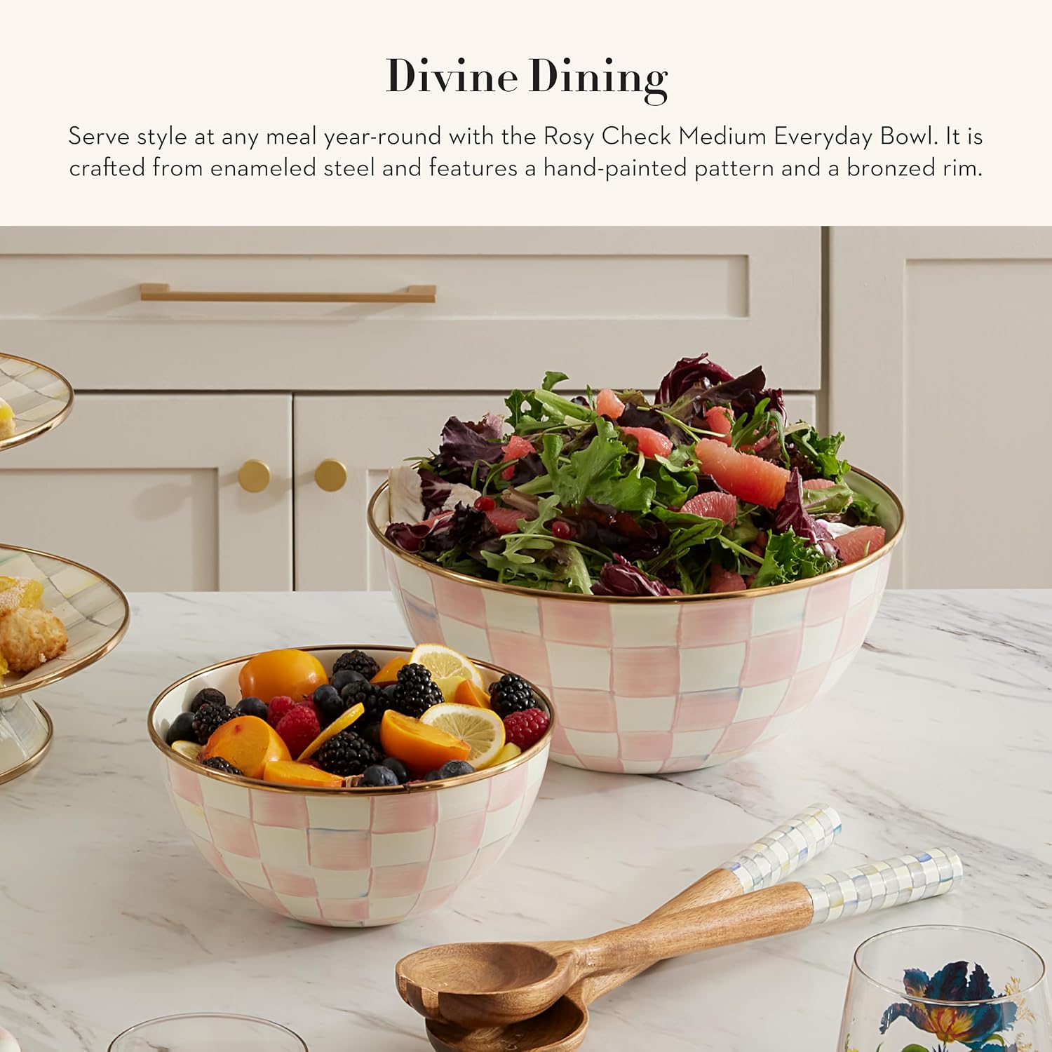- ELEGANT ESSENTIAL: Elevate any meal with this decorative bowl. It has a hand-glazed heavy-gauge steel underbody and a bronzed stainless-steel rim and is decorated with hand-painted pink-and-white checks.