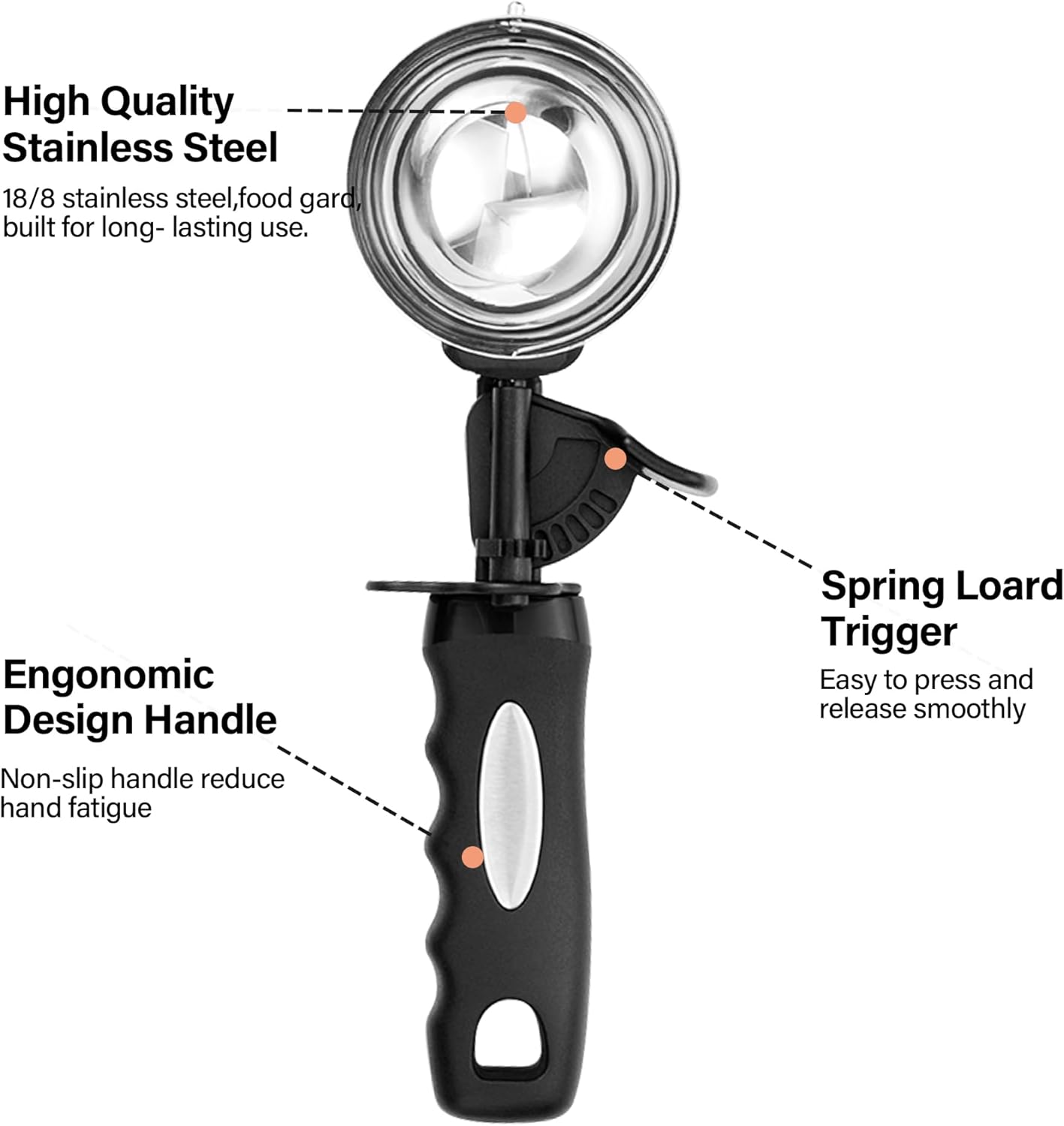 - 【Flexible Thumb Trigger System, Easy to Use】The flexible trigger system drives the scraper inside the spoon with the pressure of your thumb for easier and smoother release of food. At the same time, the Easy Spoon reduces pressure on the wrist and hand when in use, making scooping food a breeze! The handle is customized to fit the palm of your hand for a comfortable non-slip grip.