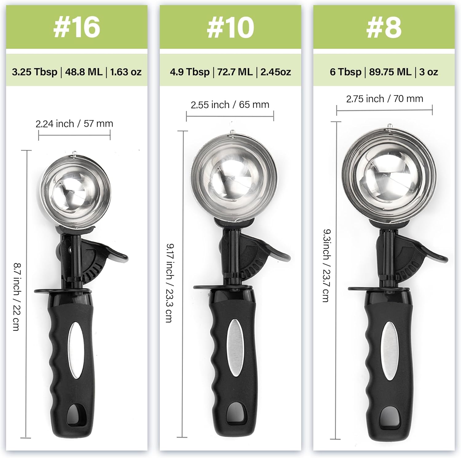 - 【Three Sizes for Multiple Uses】This ice cream scoop set includes Medium Ice Cream Scoop Scoop Diameter 2.24 inch, (3.25 Tbsp/48.8ml/1.63 oz), Large Ice Cream Scoop Scoop Diameter 2.55 inch, (4.9 Tbsp/72.7ml/2.45 oz), Jumbo Ice Cream Scoop Scoop Diameter 2.75 inch, (6 Tbsp/89.75ml/3 oz). Three different ice cream scoop sizes make it easy to create beautiful, different sized food balls and release food easily into cups, trays and bowls.