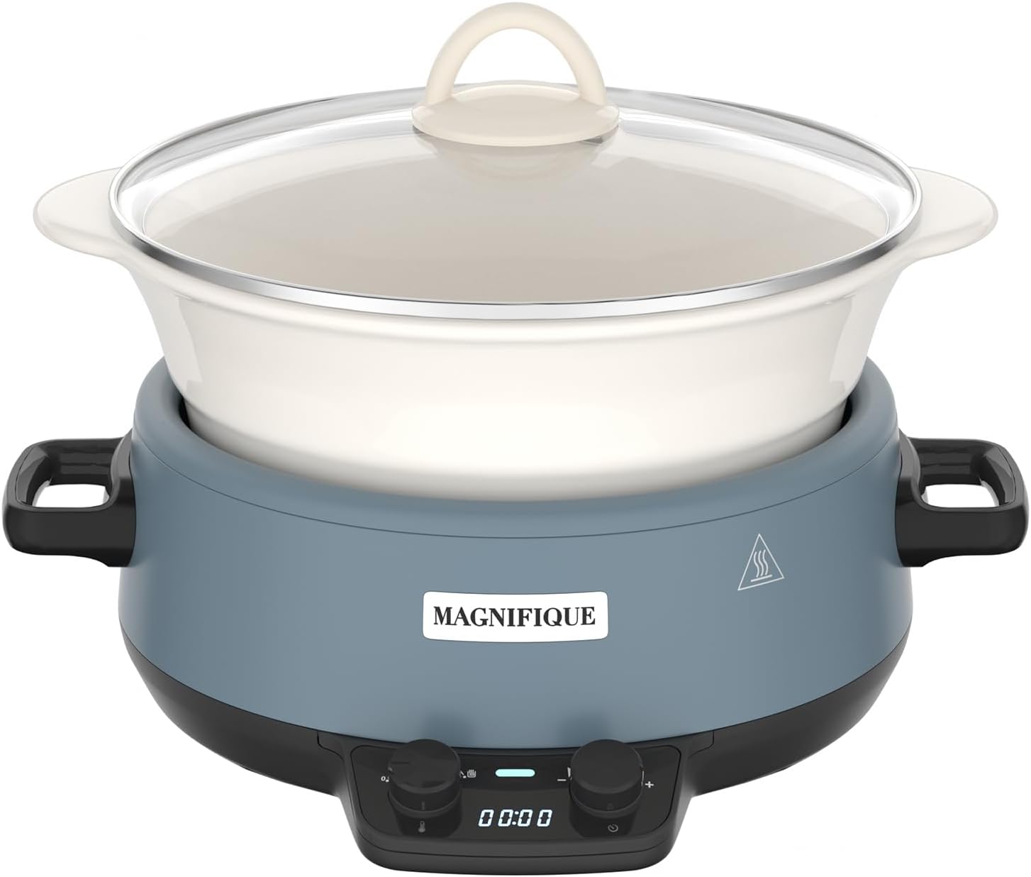 MAGNIFIQUE 5 Quart Programmable Slow Cooker with Auto Warm Setting, Glazed Ceramic Liner, Kitchen Small Appliance for Family Dinners, Blue