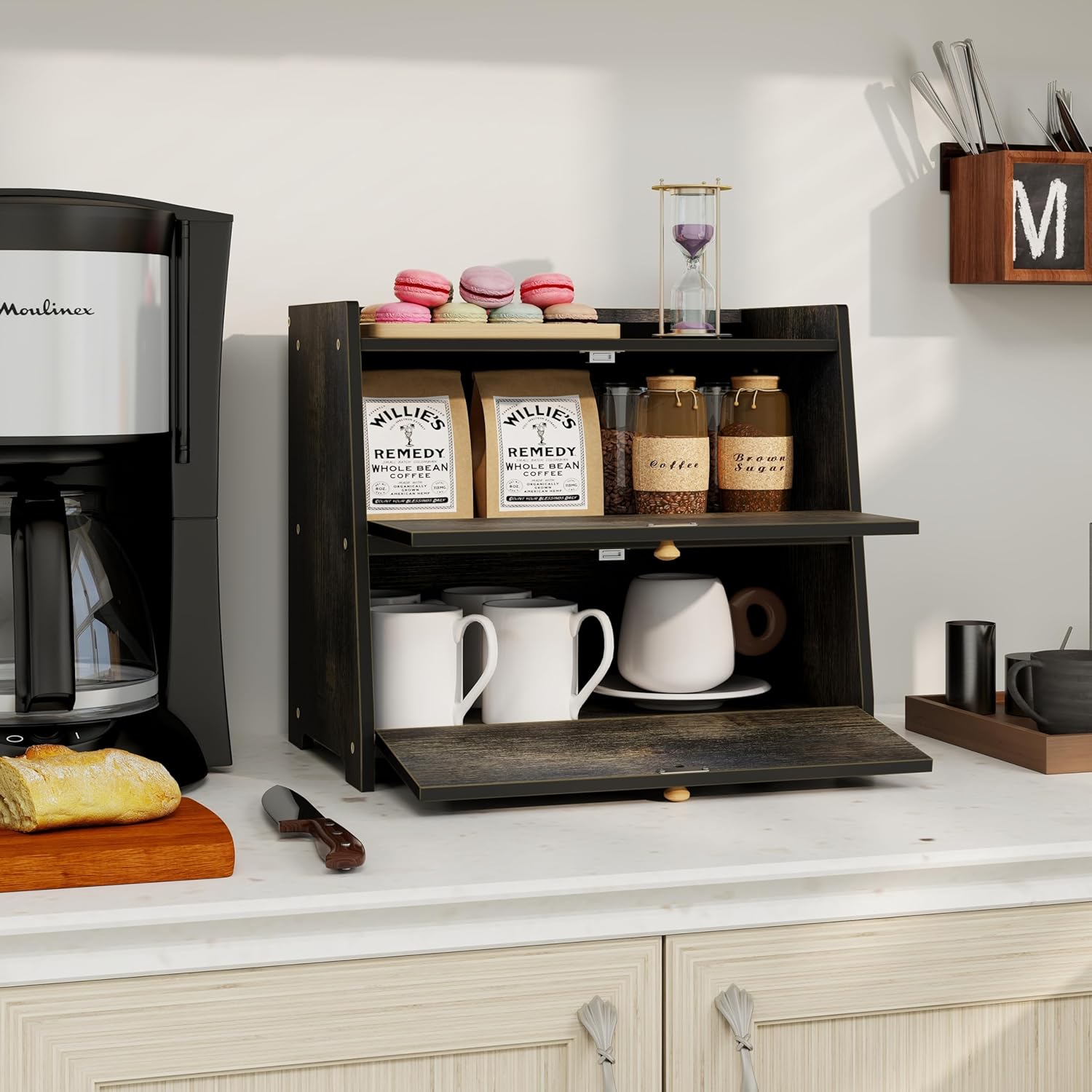 - Large Capacity:Our bread box with 2 layers of 15.8”L x 9.8”W x 13.8”H board are large enough to hold 2 large loaves of bread, rolls, muffins, and more. Flat top design,any kitchen items you want can be placed on the bread box. It can meet the needs of your family.