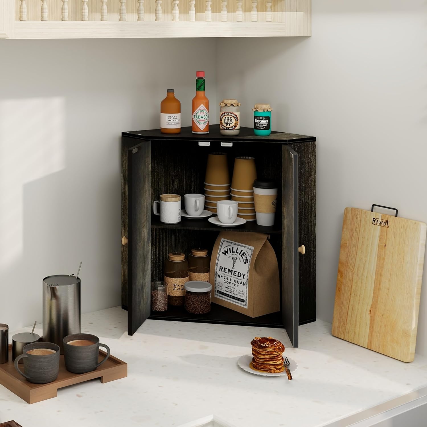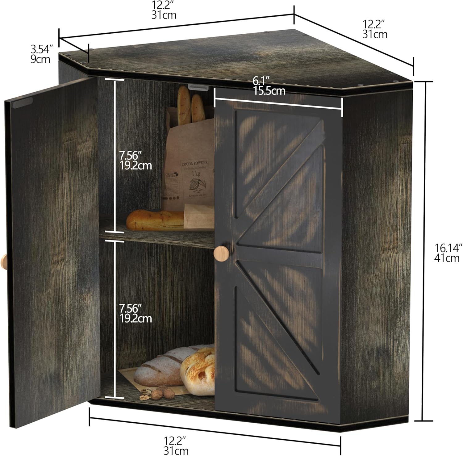 - Large Capacity:Our corner bread box with 2 layers of 16.9”L x 11.2”W x 16.5”H board are large enough to hold 2 large loaves of bread, rolls, muffins, and more. Flat top design,any kitchen items you want can be placed on the bread box. It can save your space and meet the needs of your family.