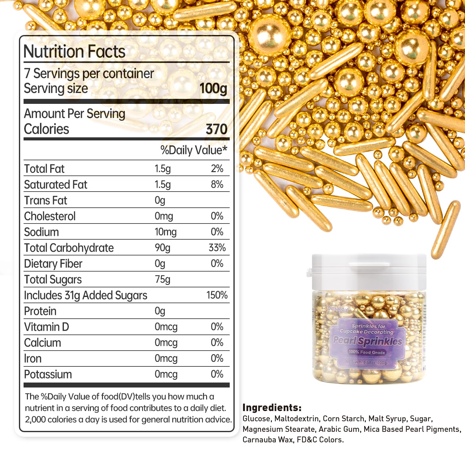 Dazzjoy Gold Pearl Rods Sprinkles, 130g/4.58oz, Mix Size, Gold Sprinkles for Cupcake Decorating, Cupcake Toppers, Cake Decorations, Ice Cream, Wedding Party Valentines Easter Supplies
