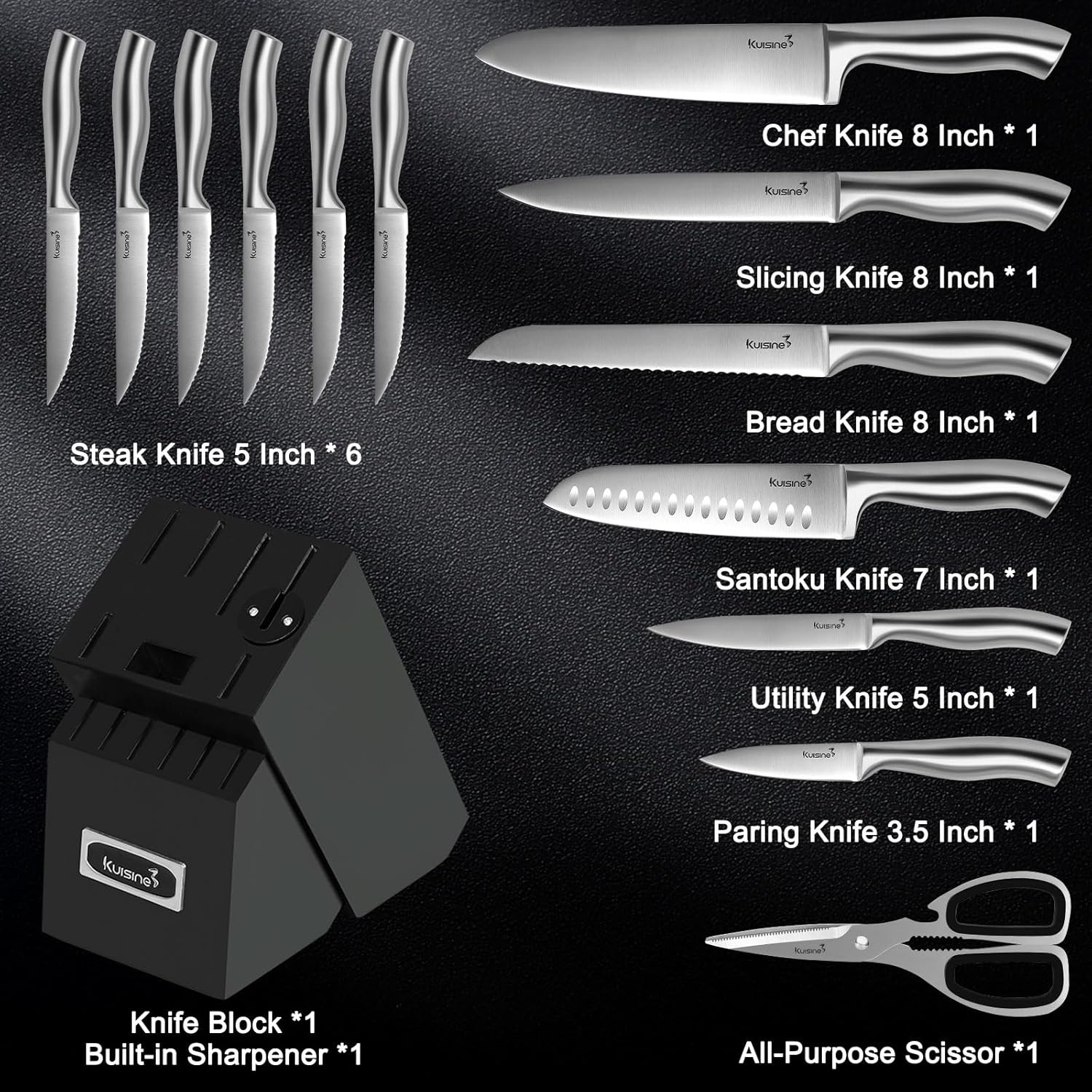 - High Value Knife Block Set: This Kuisine chef knife set includes premium 8" chef knife, 8"Slicing Knife, 7" santoku knife, 8" serrated bread knife, 5"utility knife, 3.5"paring knife, 6pcs 5"steak knife,1pair kitchen shear and a wooden block with built-in sharpener.