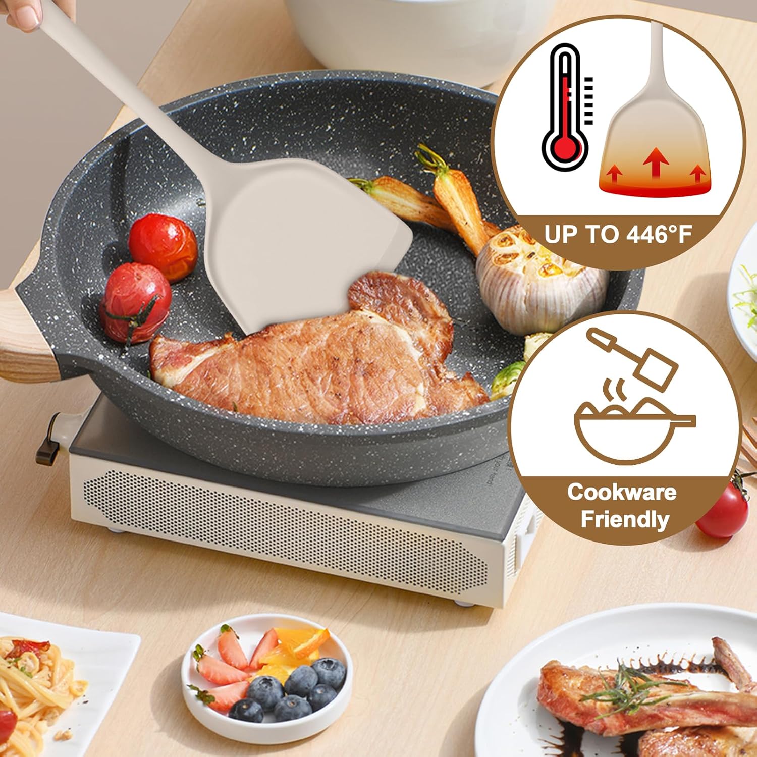 - NON SCRATCH & SEAMLESS: Smooth and soft silicone head design of the cooking utensils used for all non-stick cookware nicely, Protect the surface and leave no scratches and extend the using time of your cookware, With seamless construction, No worry about the top coming off or food trapped, A good substitution for two piece silicone utensil