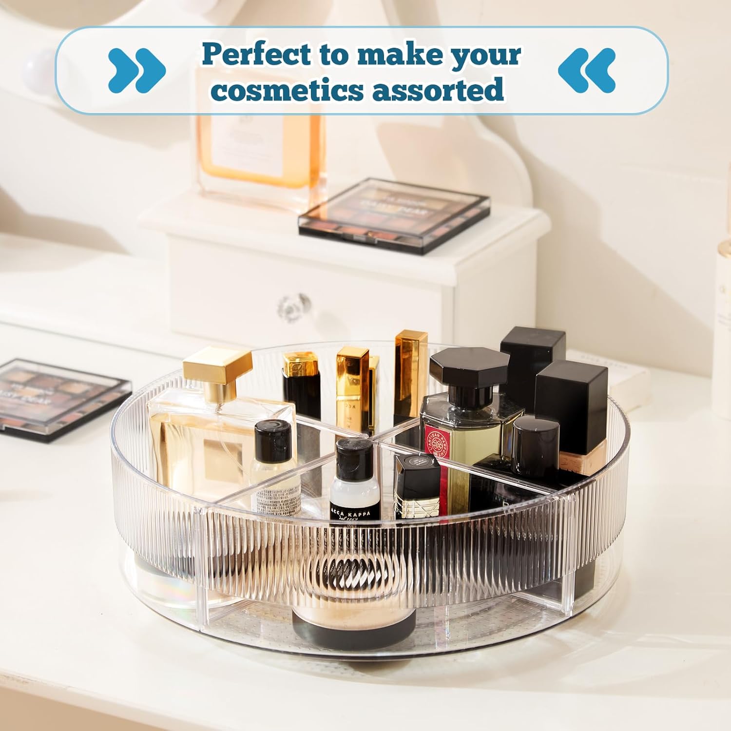 - MULTIPURPOSE ORGANIZER: This versatile Lazy Susan turntable is perfect for a variety of uses. Organize your spices, seasonings, snacks or even display items on a shelf. It also serves as a stylish cosmetics, perfumes holder or a bathroom organizer, keeping your desktop neat and tidy. The upgraded divider design makes it easier for you to separate and organize different items.