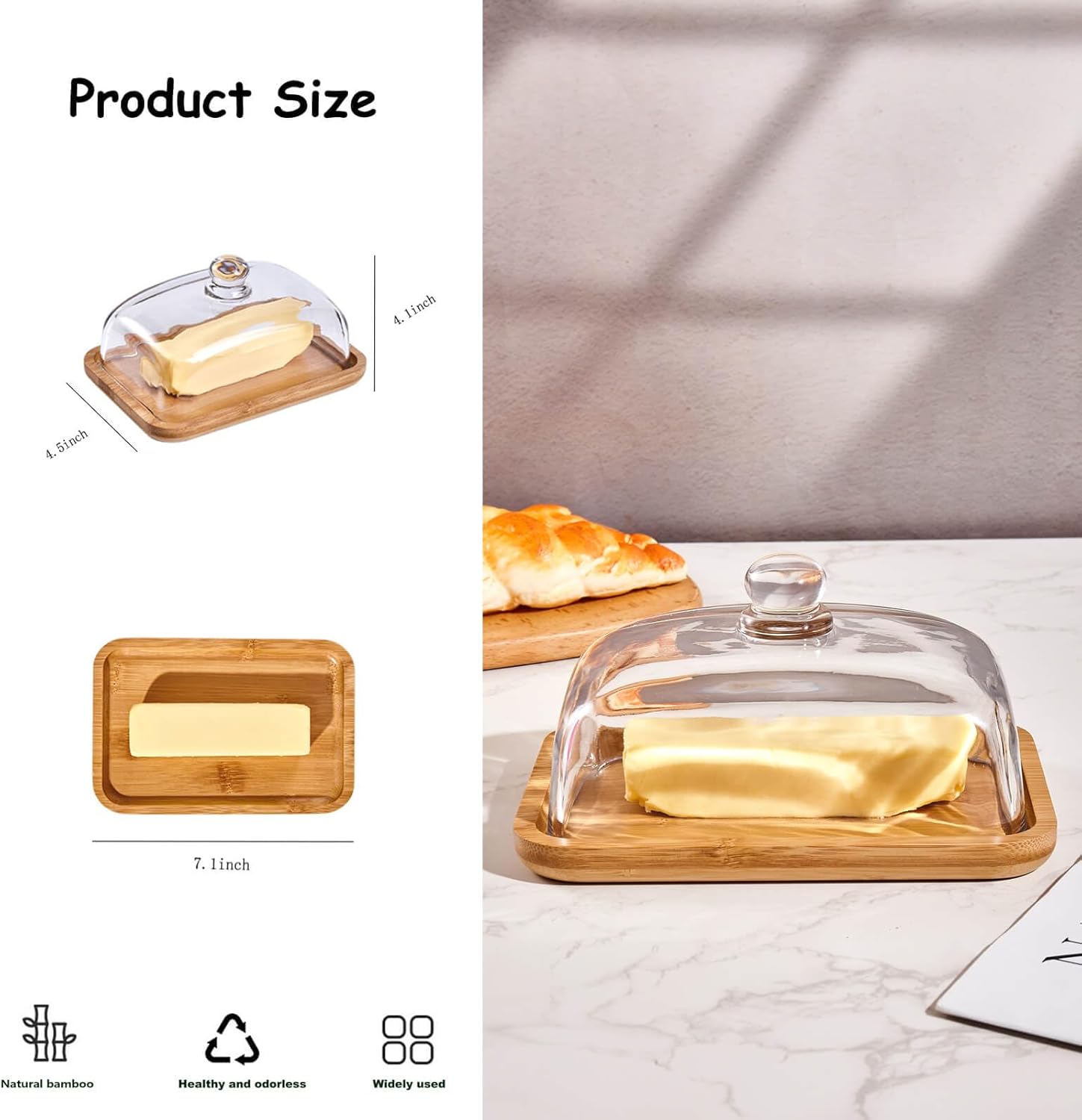- Not just a butter dish: With its simple and cute appearance, Not only can it store butter, but it can also store cakes and anything it can hold to keep your kitchen organized. The glass lid is dishwasher safe and the bamboo plate of the butter stick holder is easy to wash with a damp cloth.