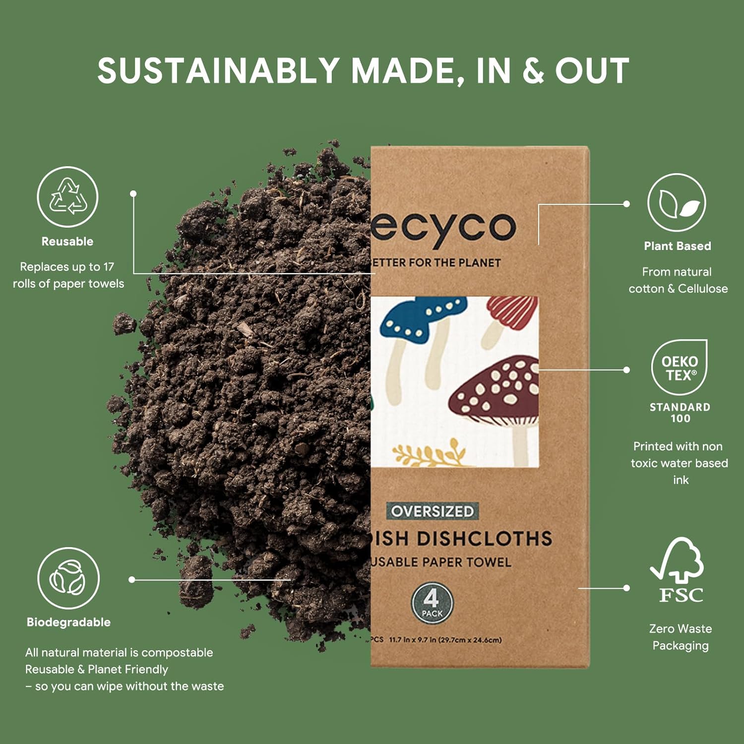RECYCO Swedish Dishcloths for Kitchen | 4 Pack Oversized Washable Dish Rags | Large Cellulose Reusable Cleaning Paper Towels | Absorbent Counter Dish Cloth Sponge XL Kitchen Wipes, 12" L x 10" W