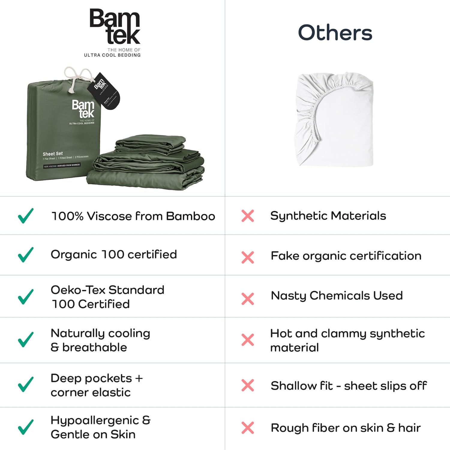 - Because You Deserve Better: Say goodbye to harsh chemicals, Bamtek 100% Viscose Bamboo Sheets are organically certified & Oeko Tex standard 100 certified - skin friendly, a hypoallergenic bedding and those who value pure natural comfort.