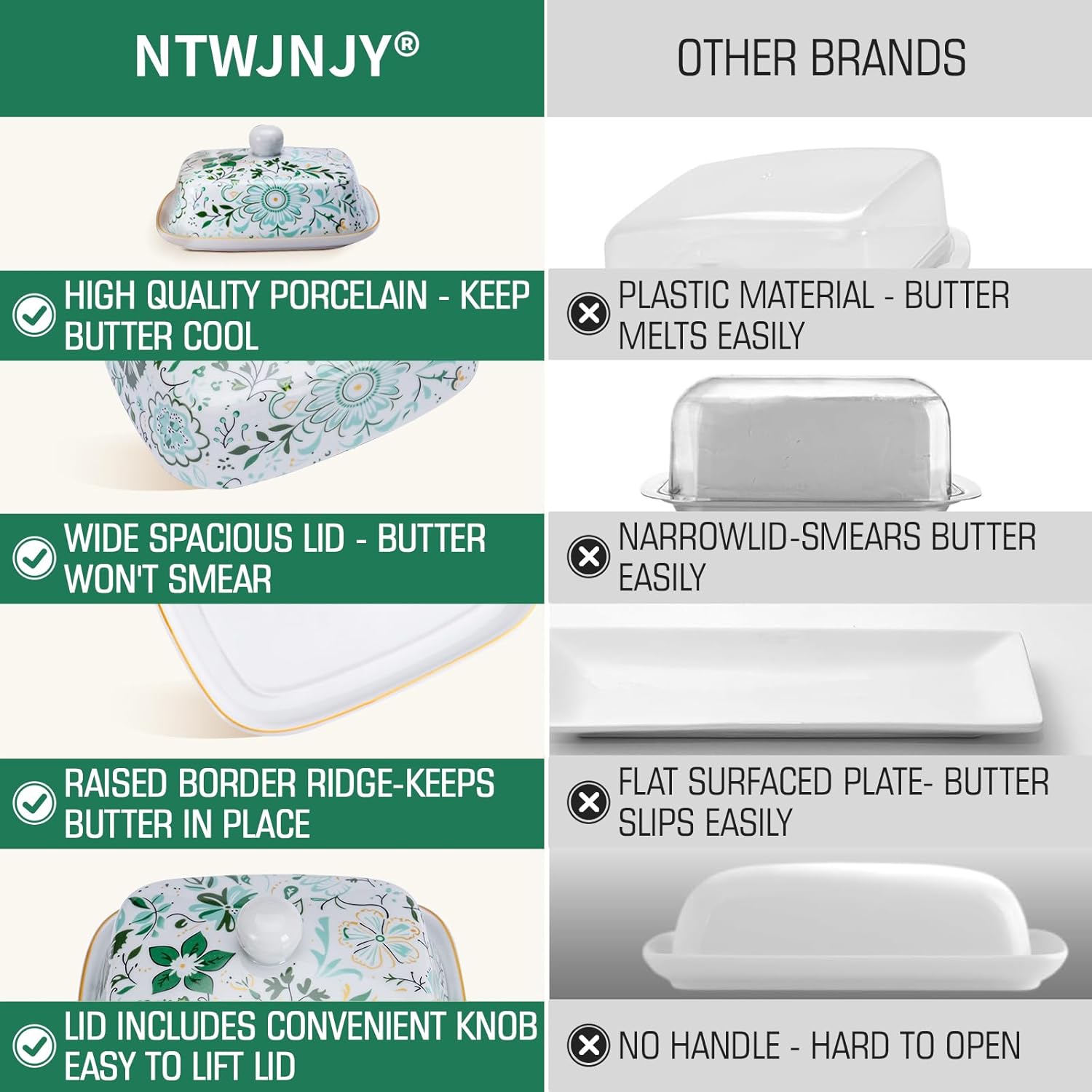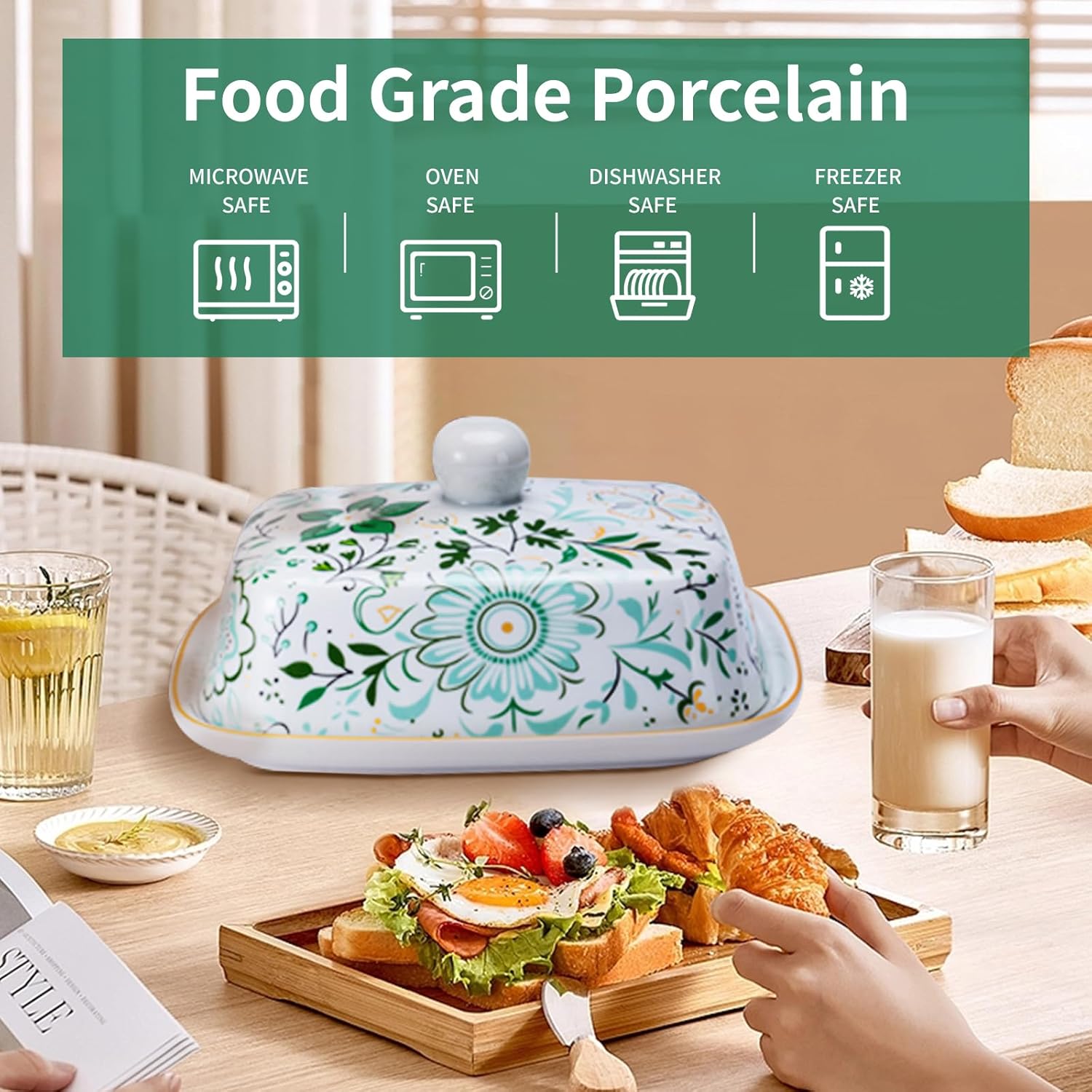 - Professional Grade Porcelain - The butter dish is made of sturdy wear-resistant, eco-friendly professional-grade porcelain for enhanced product stability. The thick walls of the butter dish keep the butter from getting too hard in the refrigerator and stay soft at room temperature. What's even more surprising is that this butter dish made of high-quality material can be used safely in the oven, induction cooktop, and dishwasher.