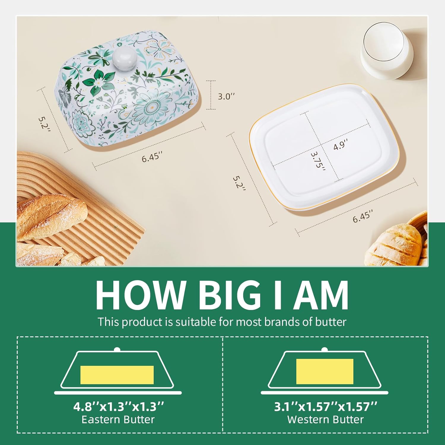 - Big Yet Compact: This covered butter dish is a 6.45” long and 5.2” wide butter dish to hold a full stick of butter. Perfect for all butter sticks, including East/West Coast butter. Appropriate size for one stick of butter to be kept of counter, dinner table, refrigerator.
