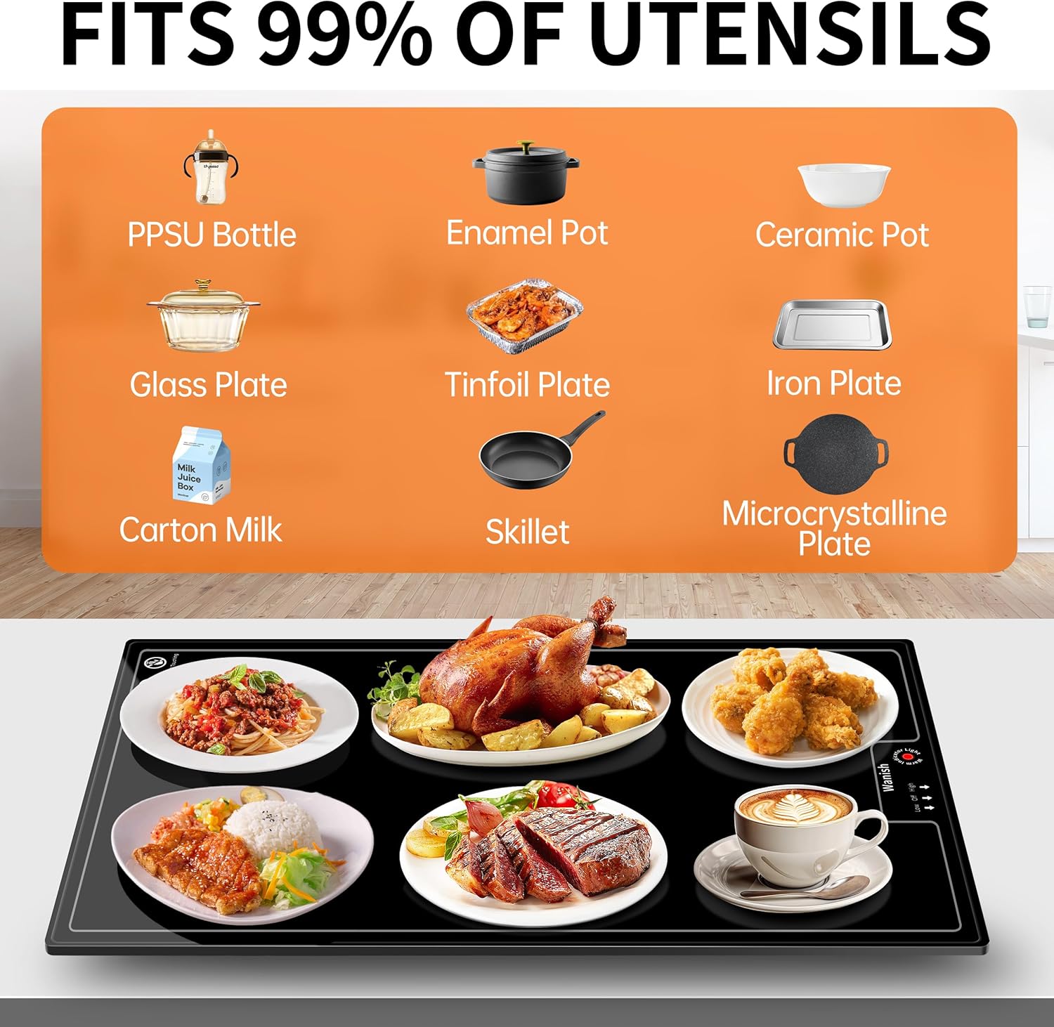 - Fast and Powerful Warmth:The 22”x14” food warmer is the perfect ally for your party food – this full-surface fast-heating, heat-resistant tempered glass warming mat keeps food at a comfortable temperature. The food warmer is made of heating wire and heating film combined with powerful 180W PTC heating innovation technology, which not only can quickly keep 4-6 plates of food warm in a short time, but also save energy (0.18kw/h). Let us use it without any burden. Let our advanced warming tray embrace the four seasons with you.If you need a larger size warming tray, please click here to purchase: https://www.amazon.com/dp/B0D8SDKSQJ?ref=myi_title_dp