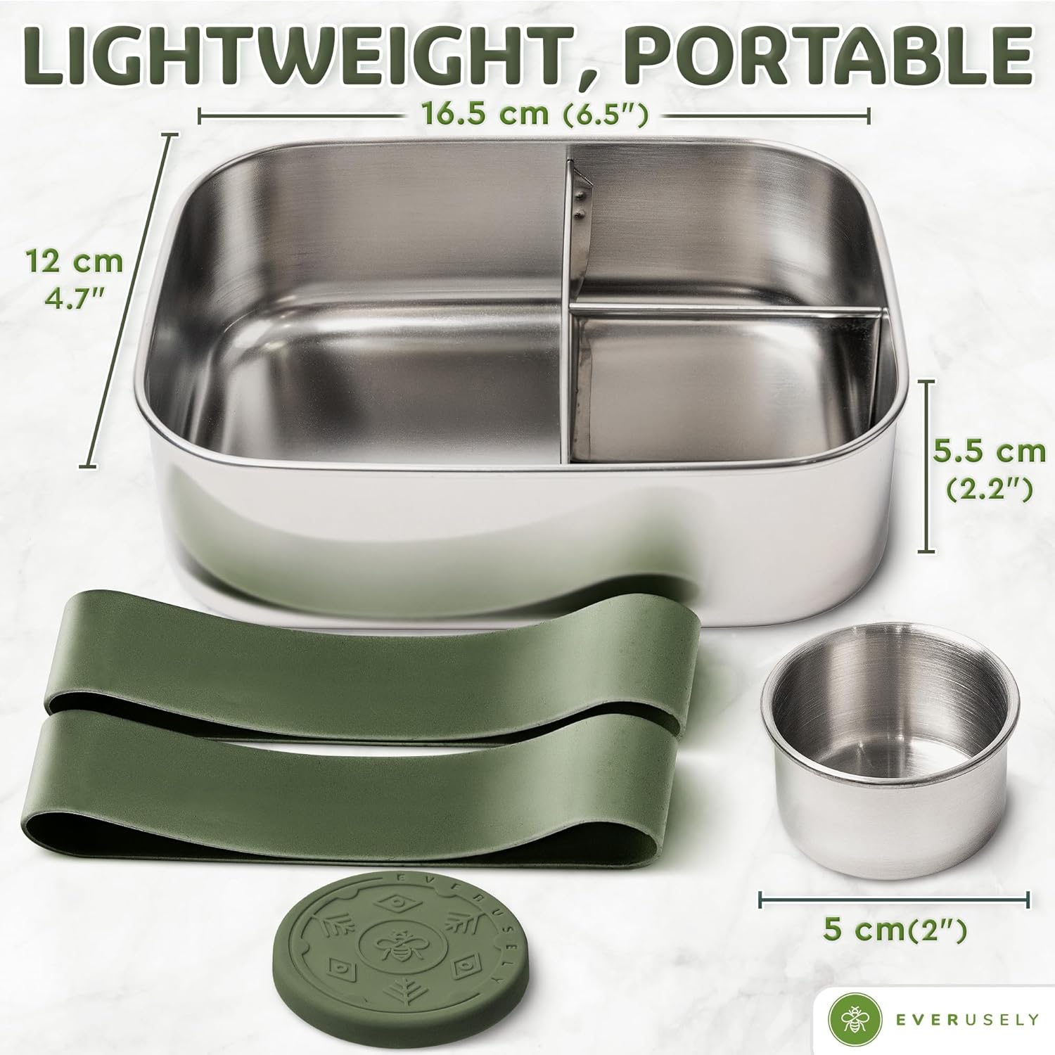 Everusely - Bento Box - Sage, 27oz / 0.8 L - Stainless Steel Lunch Box with Leakproof Condiment Container - 3 Compartment Snack Organizer for On the Go Meals - Freezer & Dishwasher Safe