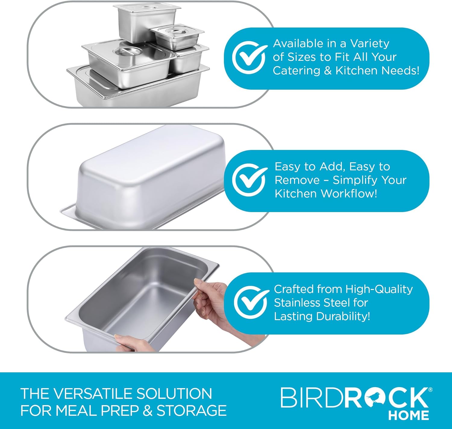 BIRDROCK HOME Stainless Steel Steam Table Pan - Hotel, Restaurant & Catering Supplies - 24 Gauge Steel, 4.1 qt Capacity - Meal Prep, Cooking, &Food Storage Container - 4" Depth, 1/3-Size (6 Pack)