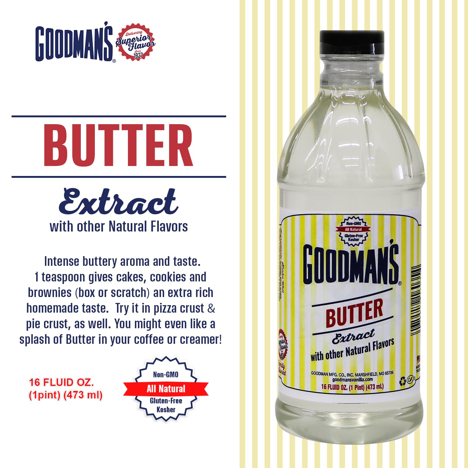 - Enhance Your Recipes: With just a teaspoon, Goodman's Natural Butter Extract enhances the flavor of your dishes, providing a delicious, buttery taste that enhances both sweet and savory creations alike.