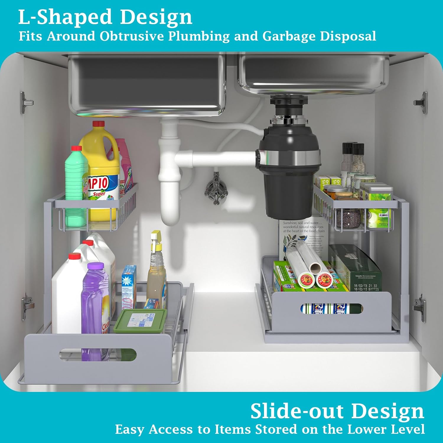 - L Shaped Design: L-shaped design with narrow top and wide bottom, leaves space for plumbing and garbage disposal, maximizing the vertical space of the sink. And the bottom tier leaves a suitable space for your tall bottles, which can solve your cabinet storage troubles.