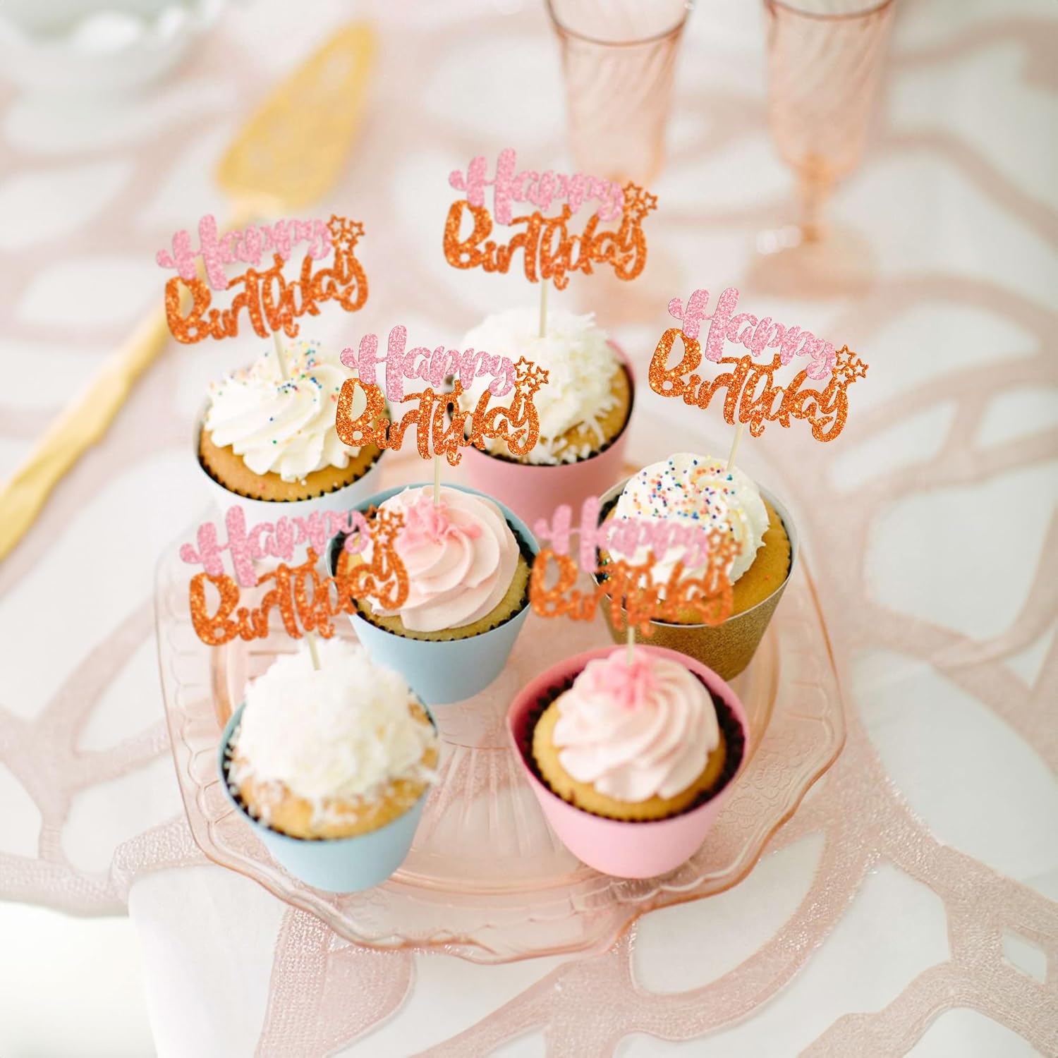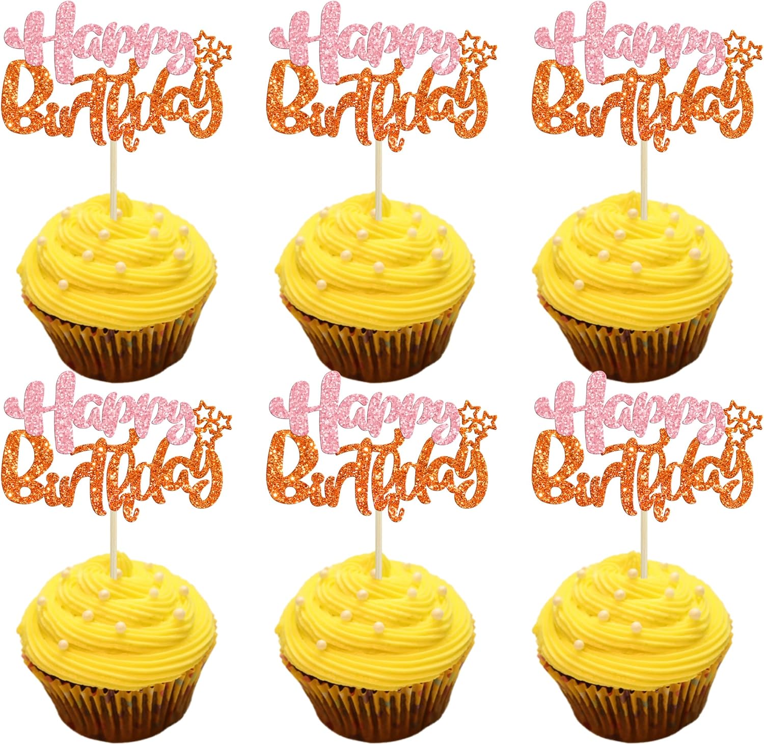 Ephlyn 24Pcs Happy Birthday Cupcake Toppers - Double Layer Glitter - Pastel Pink Orange - Perfect for Birthday, Baby Shower & Anniversary Parties