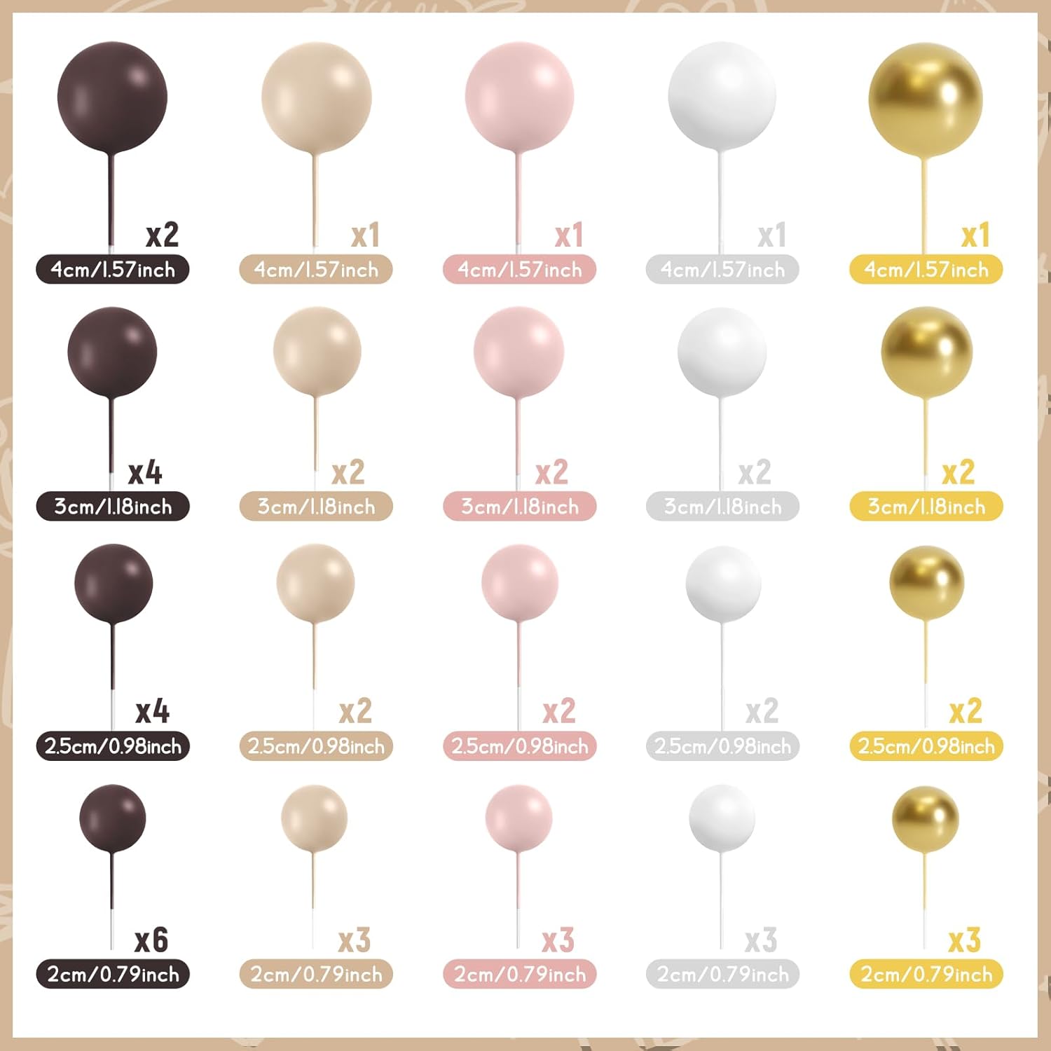48 Pcs Balls Cake Topper Decorations Balloon Cupcake Toppers Foam Cake Topper Balls for Birthday Party Wedding Cake Decorating(Brown,White,Gold)