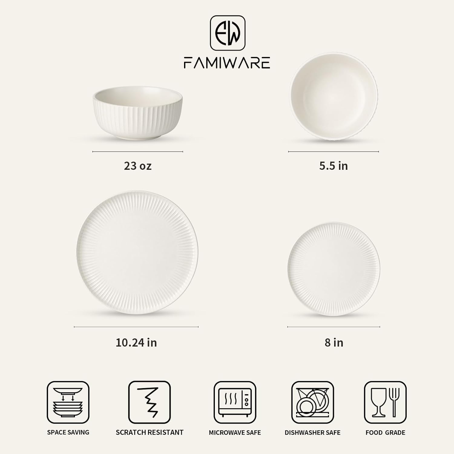 Famiware Starlight Dinnerware Sets, Plates and Bowls Dish Set of 6 (18 Pieces), Ribbed Textured Tableware - Dishwasher & Microwave Safe, Chip Resistant, Reactive Glaze, Matte Reactive White