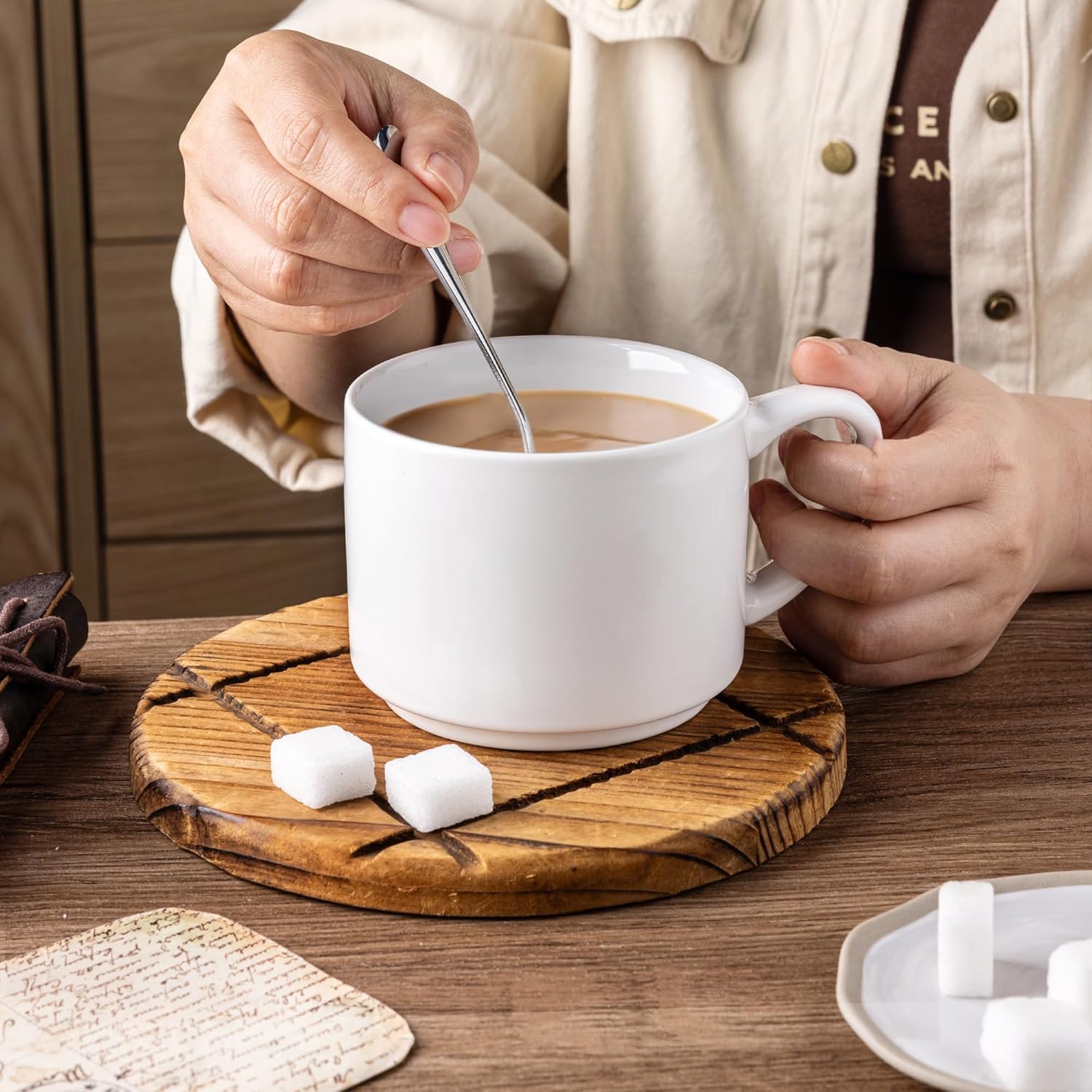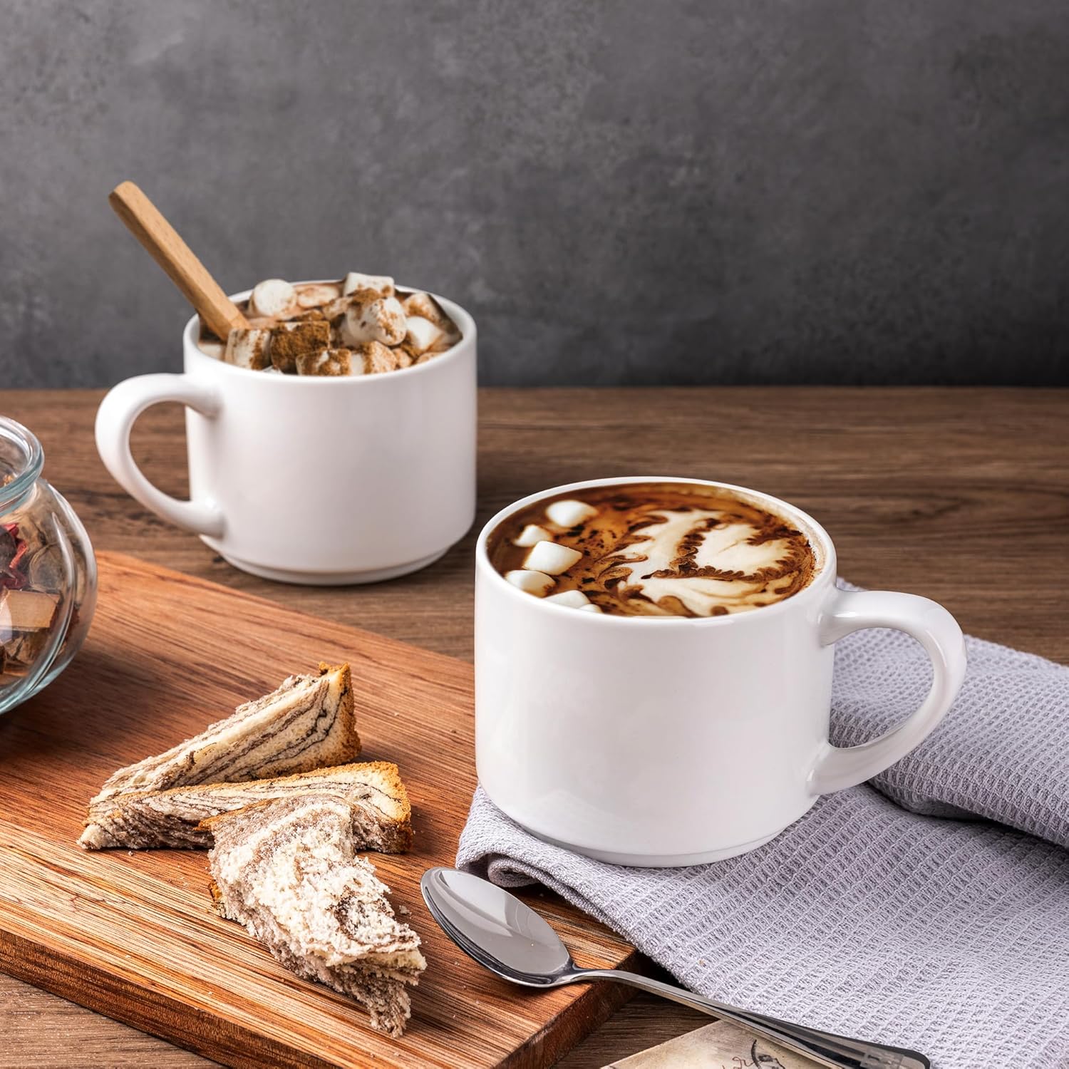 - Stylish DesignWIth Large Handle Design: These coffee mugs features a large handle that provides a comfortable and secure grip. the handle remains cool even after microwaving and the beverages stay warm. These mugs set feature a beautiful embossed texture design, the smooth rim ensures a comfortable drinking experience, and the stackable design allows for easy storage and helps save space in your kitchen.