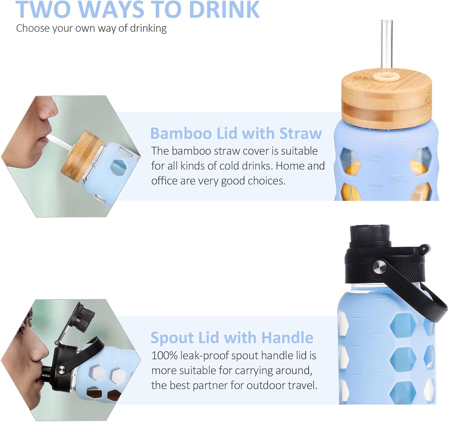 - TWO LIDS DESIGN:Natural bamboo straw lid and leak-proof spout handle lid -The bamboo straw lid makes sipping more effortless, allowing for easy hydration throughout the day whether you're at the home or office.-The spout enables smooth liquid flow and the handle attached to the lid allows for easy carrying on the go.Suitable for gym and outdoors.