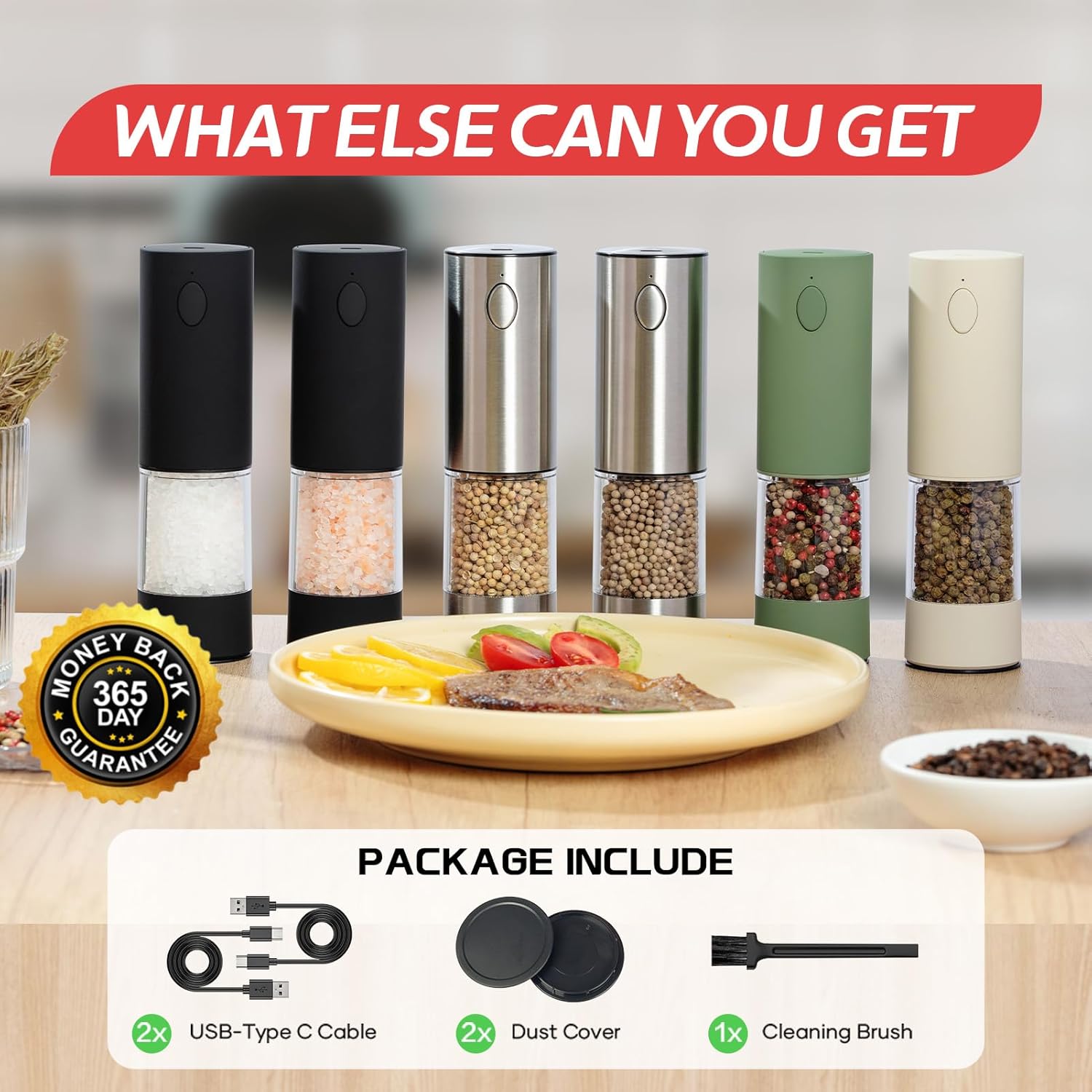 - Effortless One-Hand Operation & Arthritis-Friendly Design - Designed for busy kitchens and sensitive hands! Simply press the top button with one hand to grind spices effortlessly—no twisting or gripping required. Perfect for seniors, arthritis sufferers, or multitasking cooks. The USB-C rechargeable system eliminates disposable batteries (fully charges in 2 hours!), saving costs and reducing waste