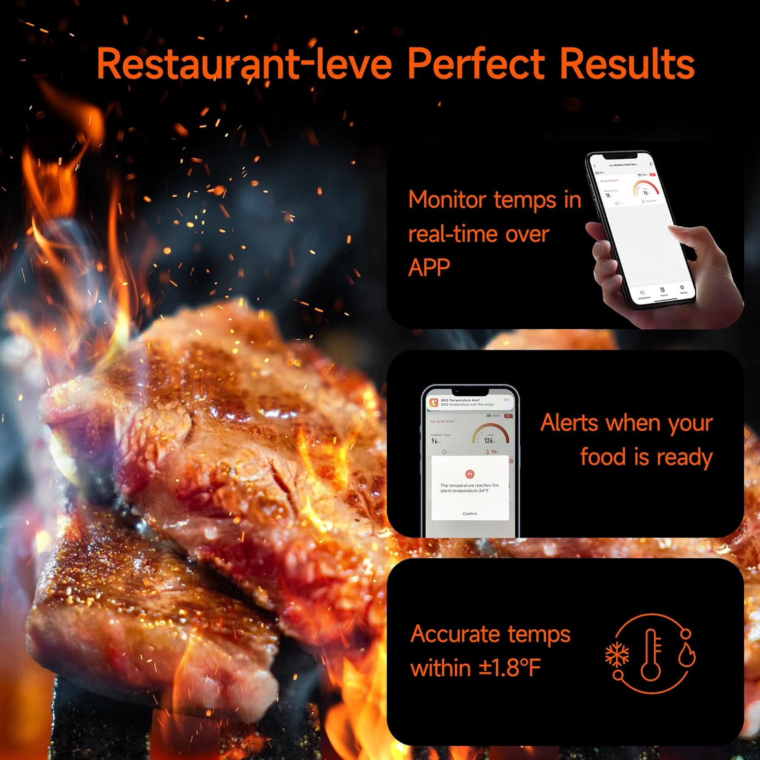- 【More Accurate and Fast】 This bluetooth meat thermometer, featuring two built-in industrial-grade sensors, offers swift and precise readings from any angle, ensuring accuracy. It takes the guesswork out of grilling, so you can bid farewell to the worries of overcooked or undercooked meals.