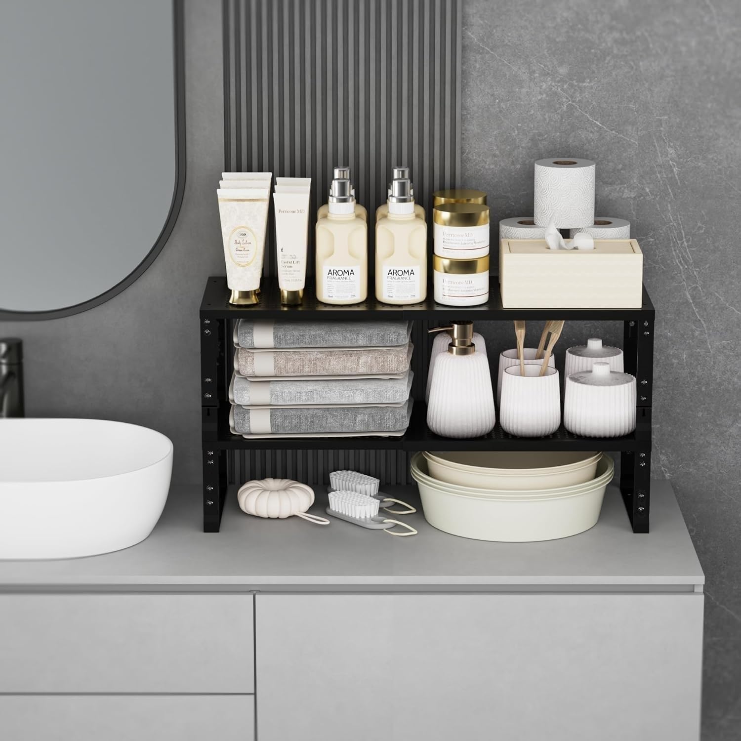 - ⭐【Expandable,Stackable】The shelves can easily expand and contract according to your storage needs, whether it is kitchen clutter or office supplies.You can combine multiple shelves together to form a large storage system, or separate them into several separate smaller units(Measure:8.11"D x 16.54"W~27.17"W x 8.31"H/7.68"H/7.05"H/6.42"H)