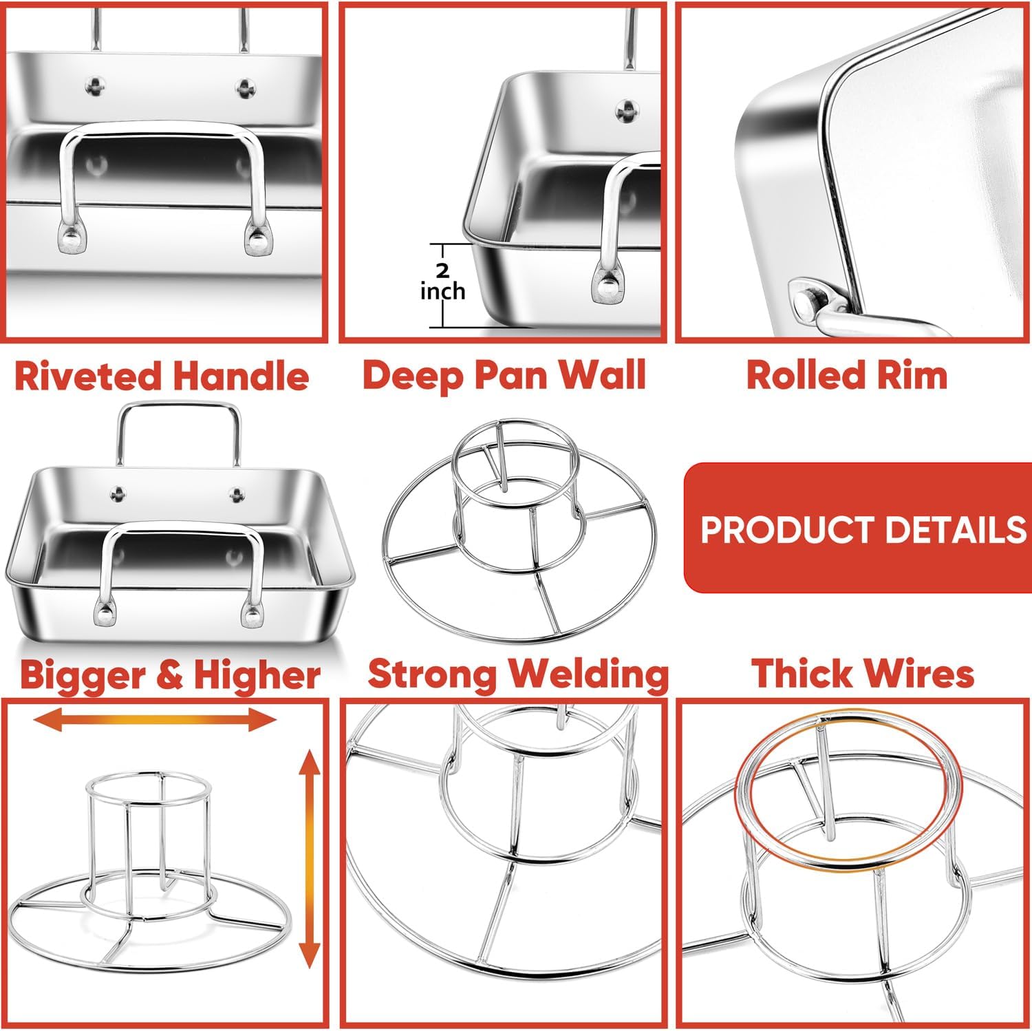 - Practical design, wide and riveted stainless steel handles offer a convenient and secure grip, which makes it safer for you to move the roasting pan in and out of the oven, 2 inch deep Side design for containing more food