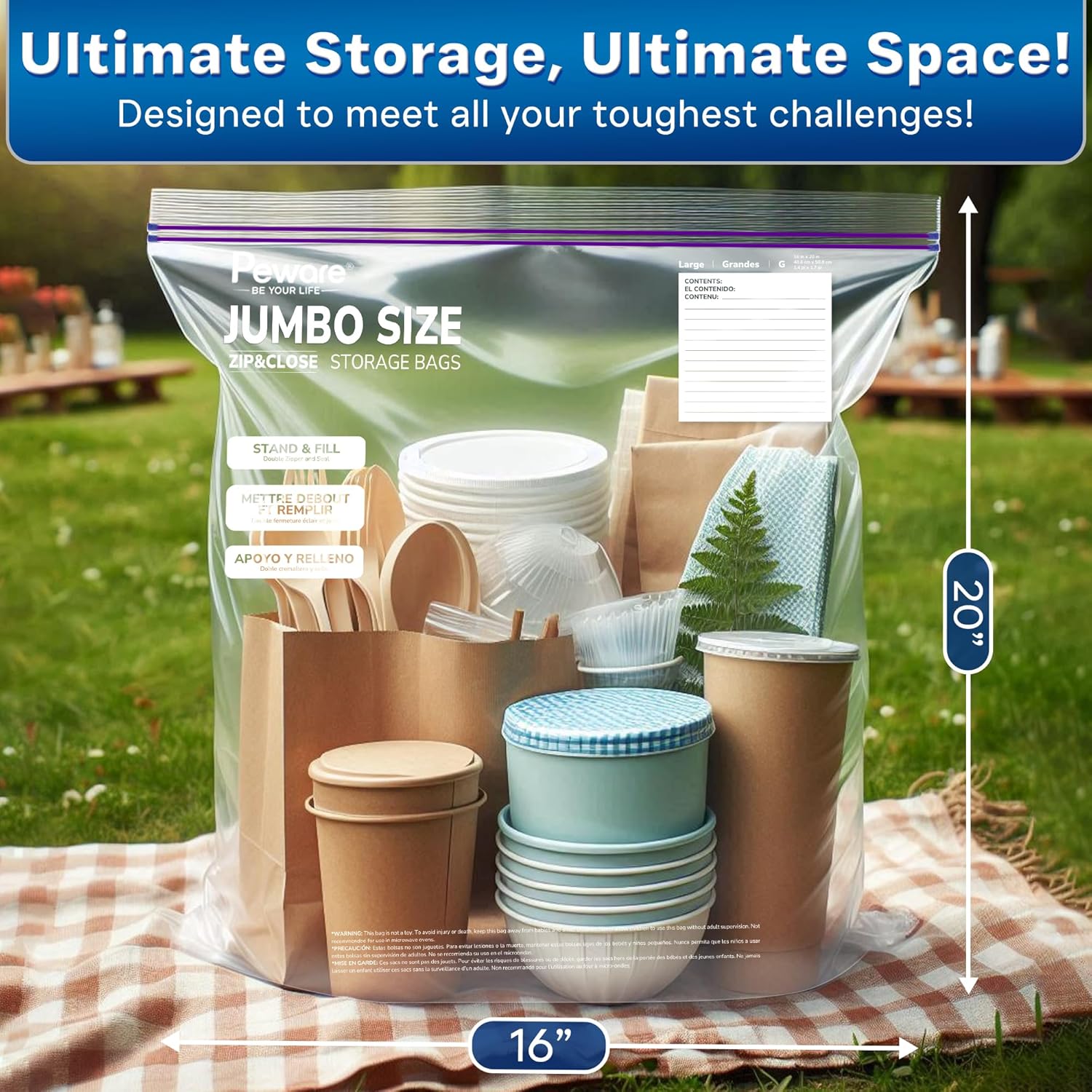 Large Storage Bags, 16"x20" Jumbo Plastic Bag, BPA Free, 3.5 Gallon XL Zipper Lock Baggies for Clothes Pillow Travel Moving - 15 Roomy Bags