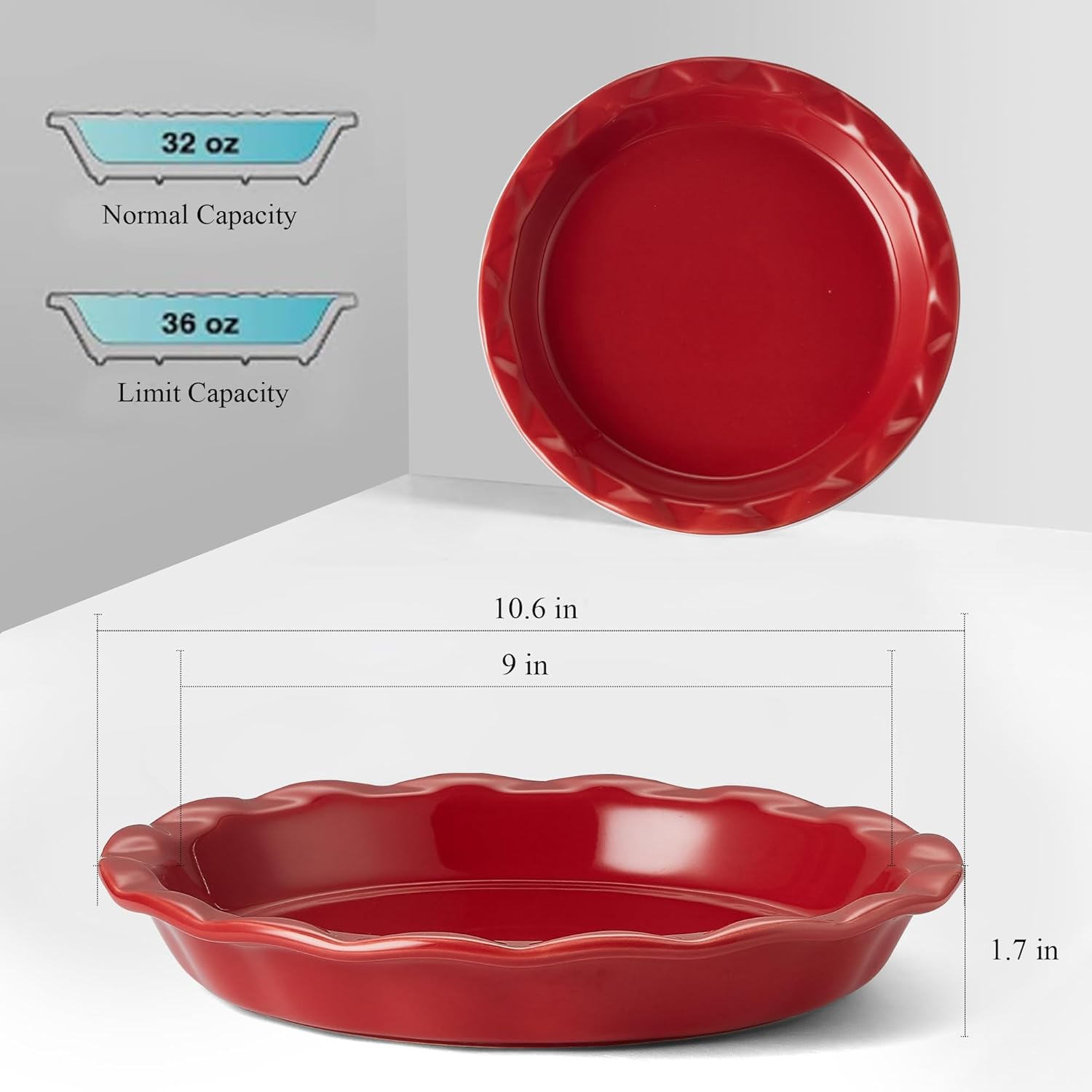 - Versatile - Our deep dish pie plate size is spot-on β 9.5 inches in diameter, 1.7 inches high. It's perfect not only for crafting various types of fruit pies but also for baking quiches, cakes, and more. One pie pan, countless possibilities, catering to your baking creativity