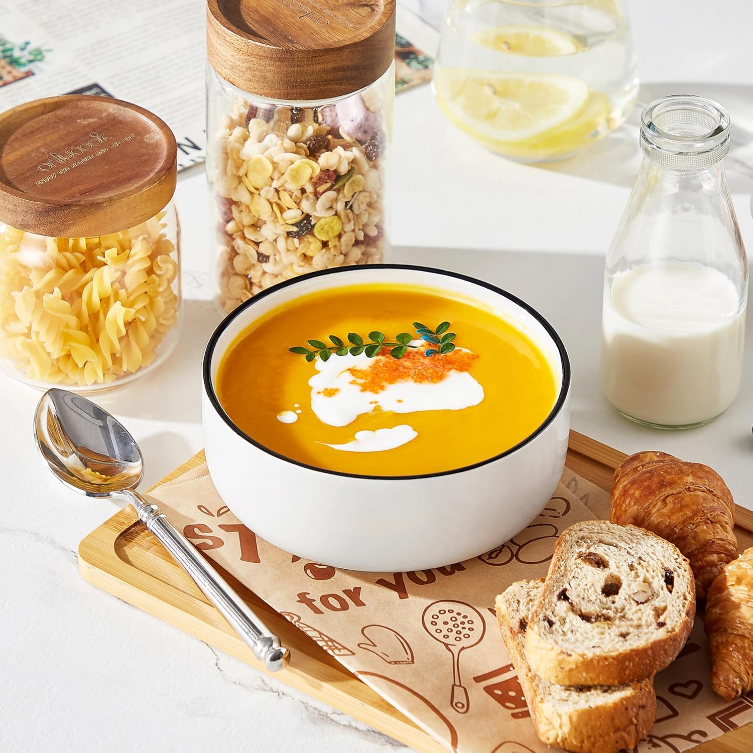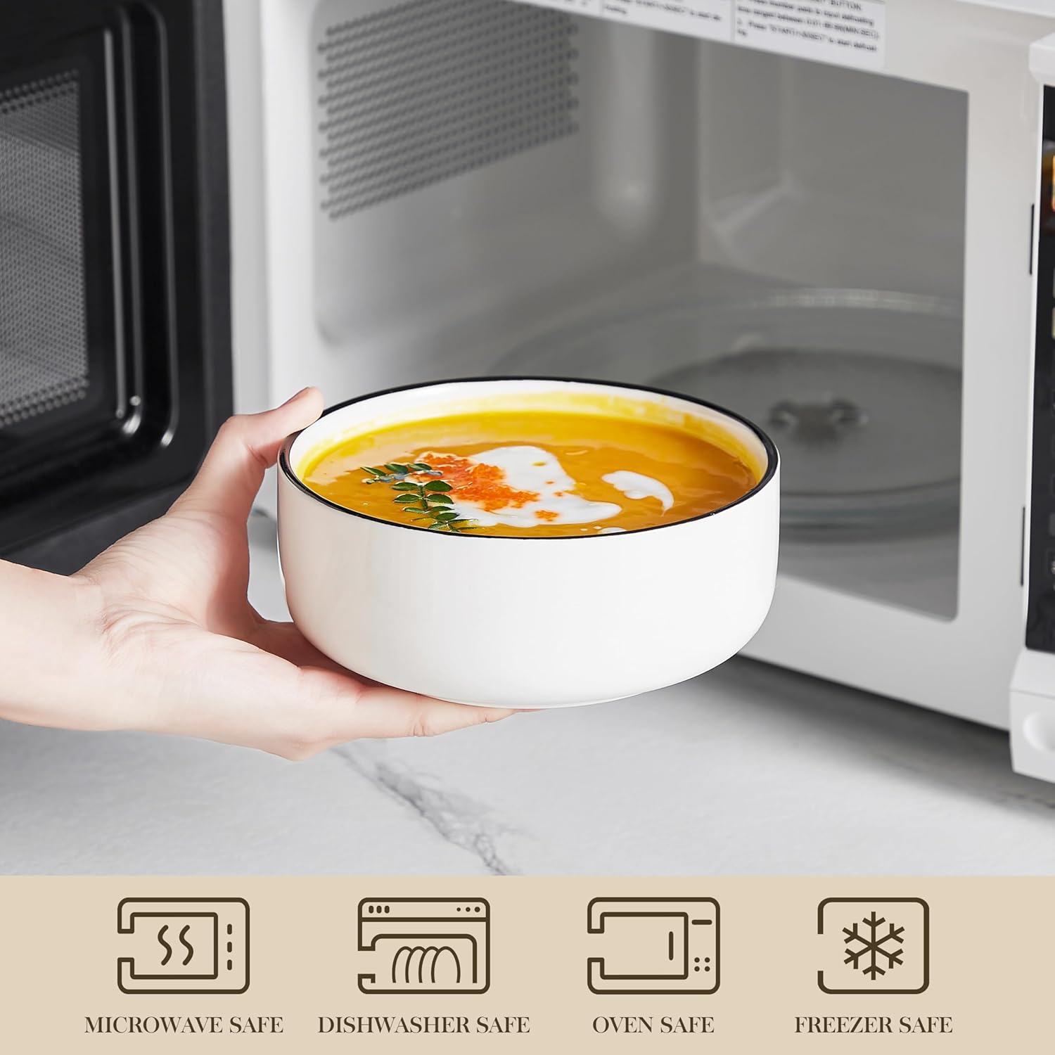 MALACASA 24 OZ Cereal Bowls, Porcelain Soup Oatmeal Bowls Set of 6, White Kitchen Ceramic Serving Bowl wtih Black Rim, Dishwasher Microwave Oven Safe, White, Series LUNA