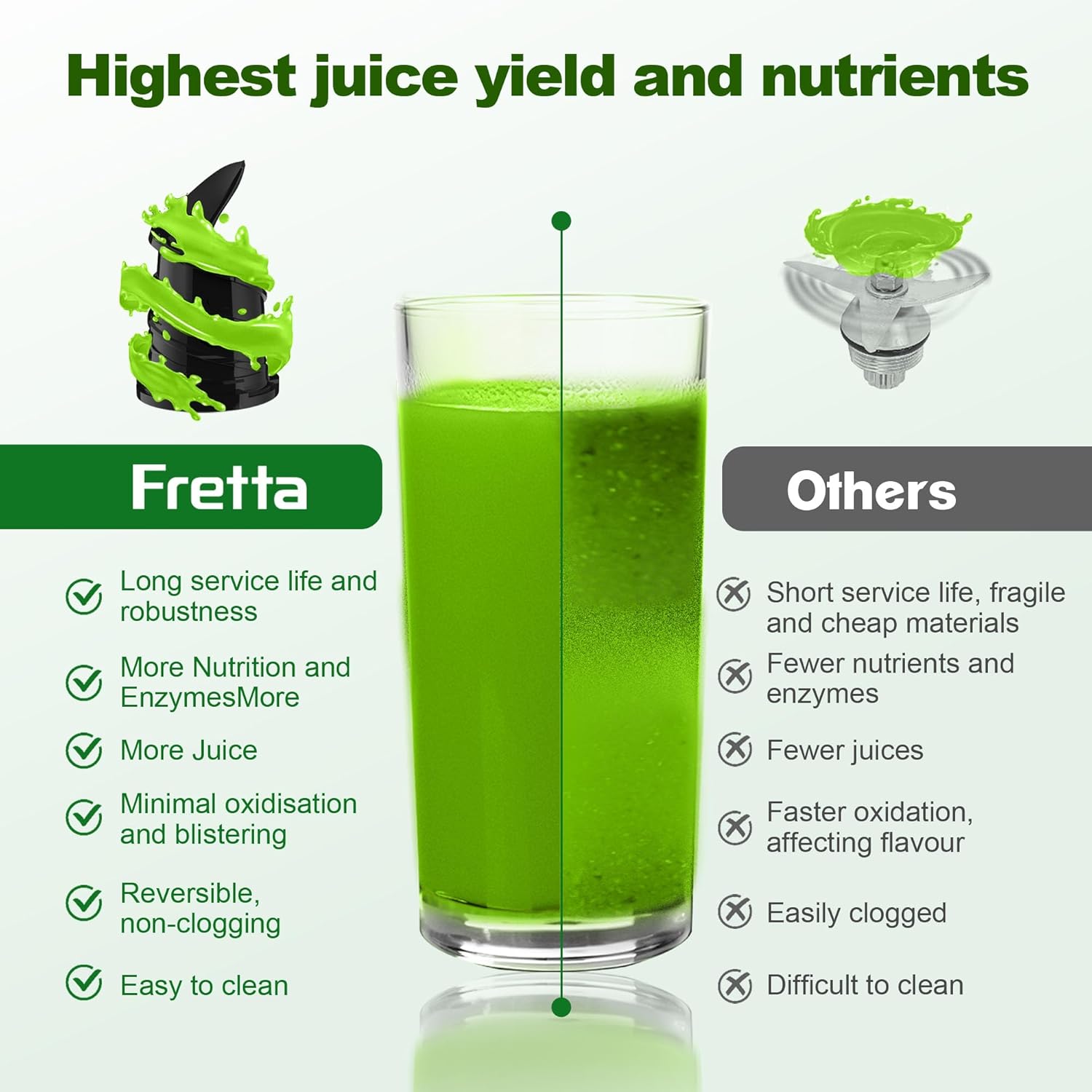 - Safe BPA-Free Materials for Health Protection: Fretta cold press juicer is made from BPA-free materials and come without any blades or sharp parts, making it safe for your entire family.